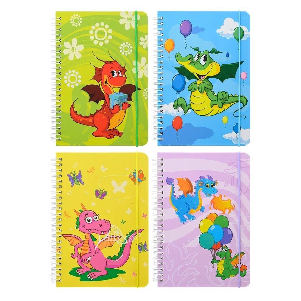 Блокнот детский: "ДРАКОН"; цветная 7БЦ обложка с рисунком /ассорти/, на резинке, двойная евроспираль; блок-клетка, 60 листов; 20,5*14 см. В коробке 160 шт.