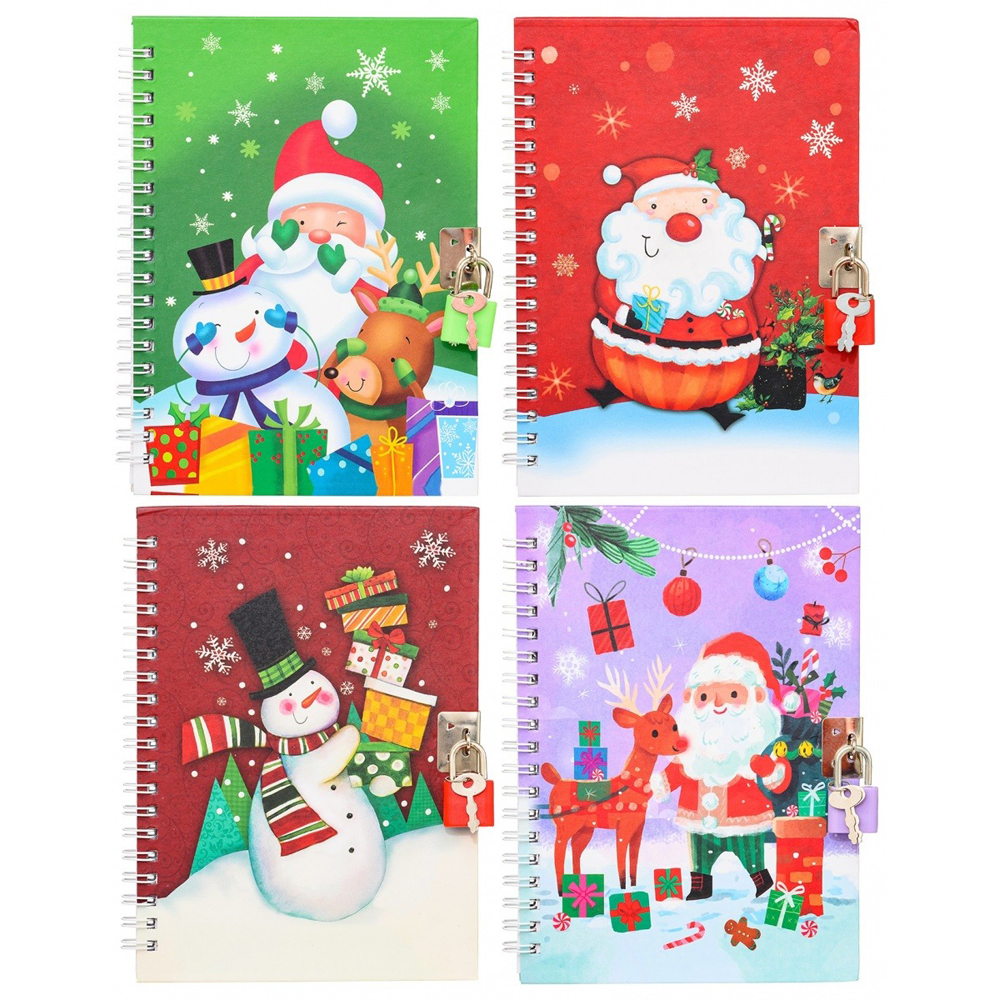 Блокнот детский+замочек: "НОВОГОДНИЕ"; яркая цветная 7БЦ обложка с рисунком /ассорти/, блок-клетка, на гребне, 48 л.; 15*11 см. В коробке: 240 штук.