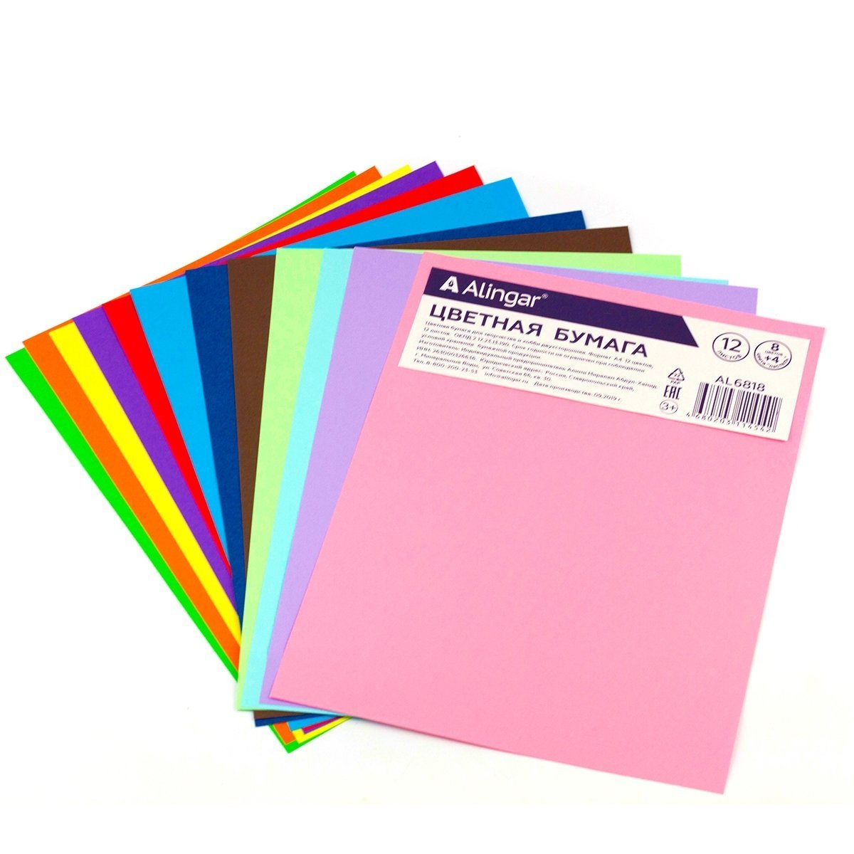 Цветная бумага - замечательный инструмент для творчества. В набор входят 12 листов 12-ти цветов. Блок - офсетная бумага, формат А4. Цветная бумага собственного произдводства - АЛИНГАР, в набор входит пакет с клеевым клапаном.
