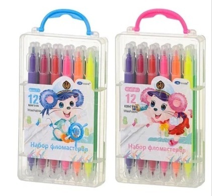 Набор фломастеров: /МЫШКИ/, двусторонние, цветной корпус, вентилируемый колпачок, упаковка-пластиковый чемоданчик, 12 цветов. В коробке 120 упаковок по 12 фломастеров.