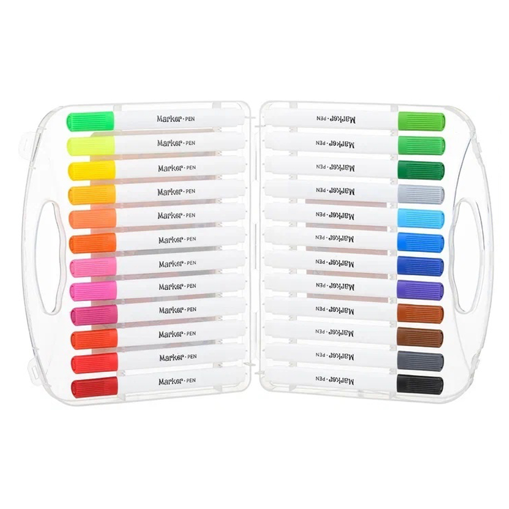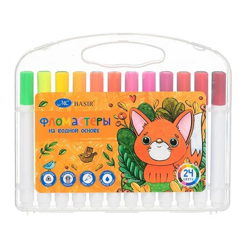 Набор фломастеров: "ЛИСА"; с мягкой кистью /толщина линии 1-7 mm/, на водной основе; трёхгранный белый корпус, вентилируемый колпачок, упаковка-пластмассовый бокс, 24 цвета. В коробке: 56 наборов.
