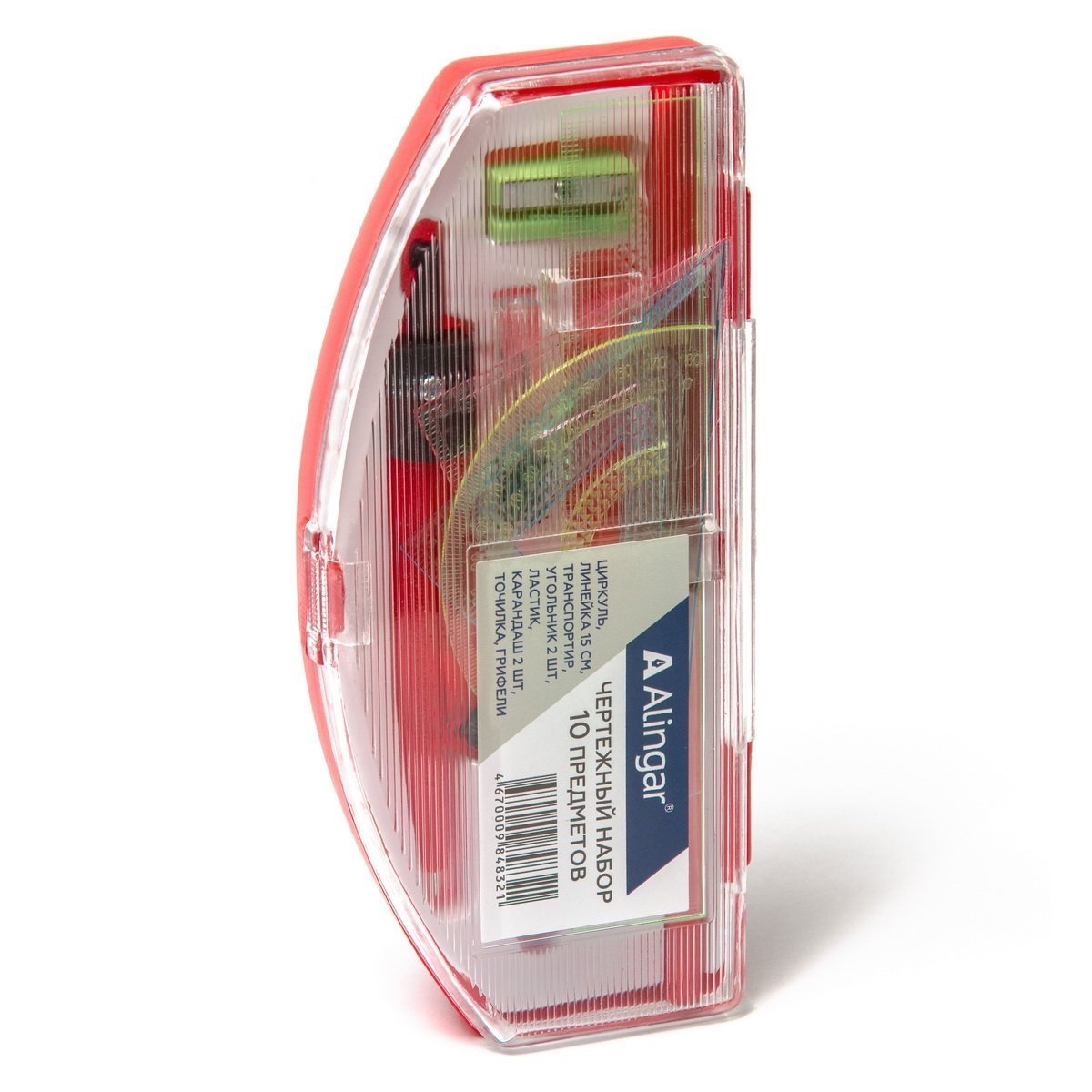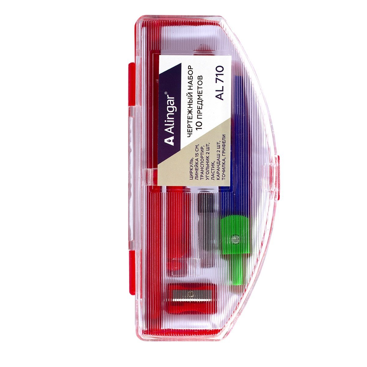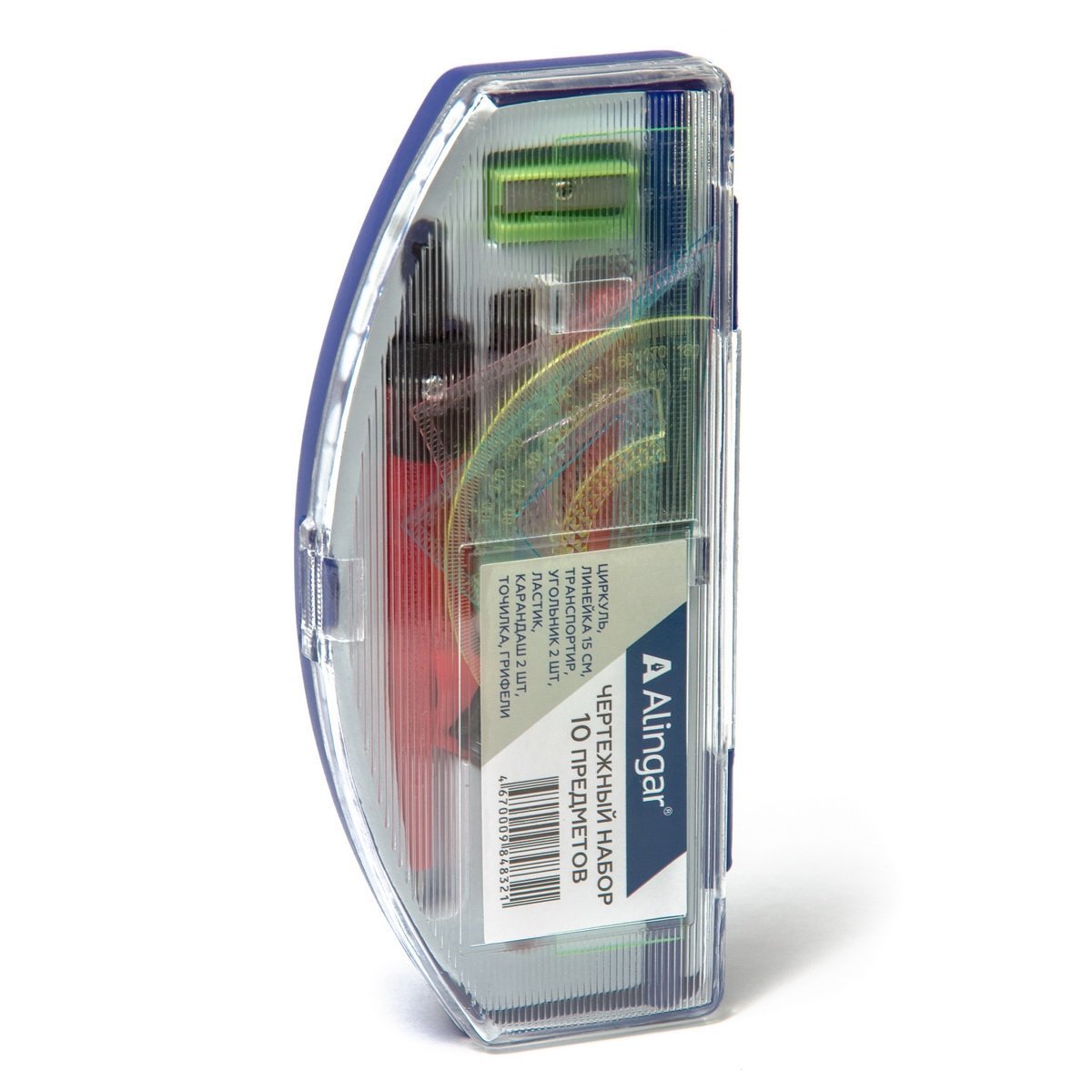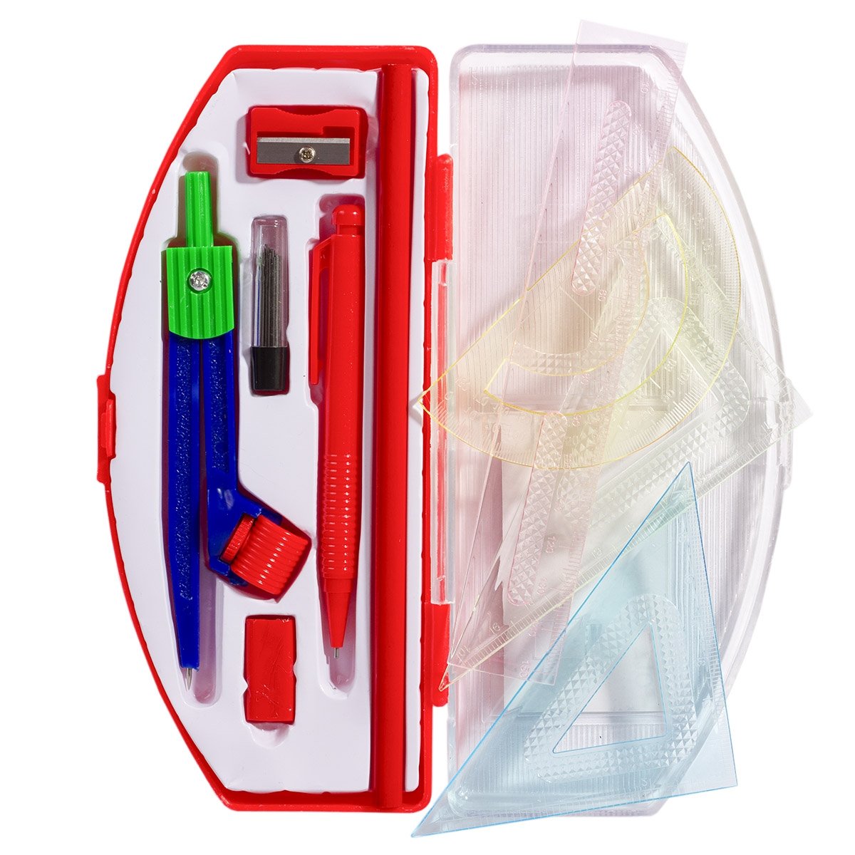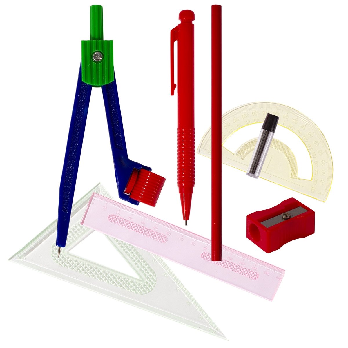 Готовальня включает 10 предметов: металлический циркуль , линейка 15см, транспортир, угольник 2 шт, ластик, карандаш, точилка, грифели. Все металлические детали чертежных инструментов выполнены из высококачественной прочной стали и надежно скреплены между собой.