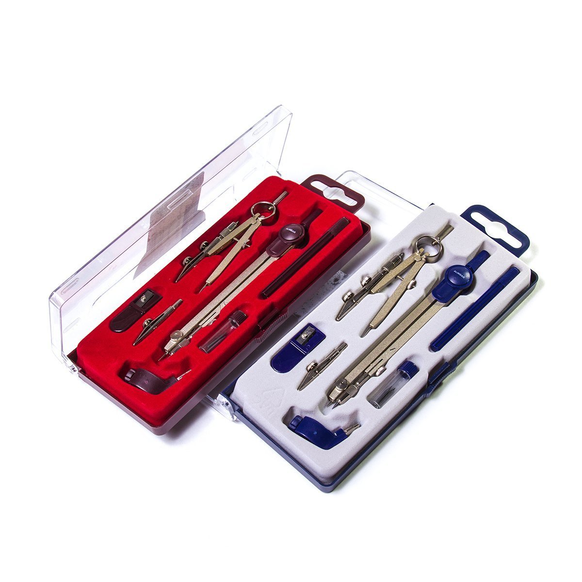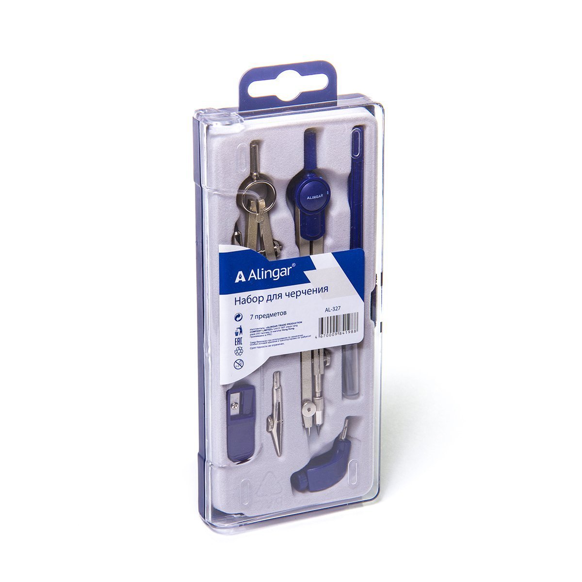 Набор чертежных принадлежностей из 7 предметов включающий в себя: металлический циркуль с пластиковым держателем 105 мм, циркуль-балеринка 55 мм, рейсфедер, пластиковый держатель рейсфедера, насадка для крепления карандаша, запасной грифель в контейнере, точилка для грифеля.