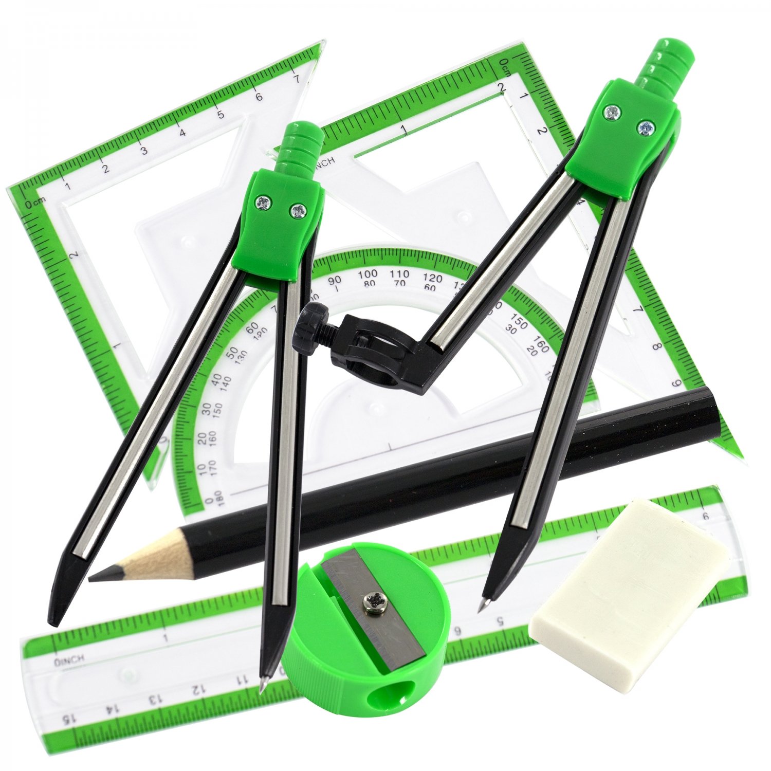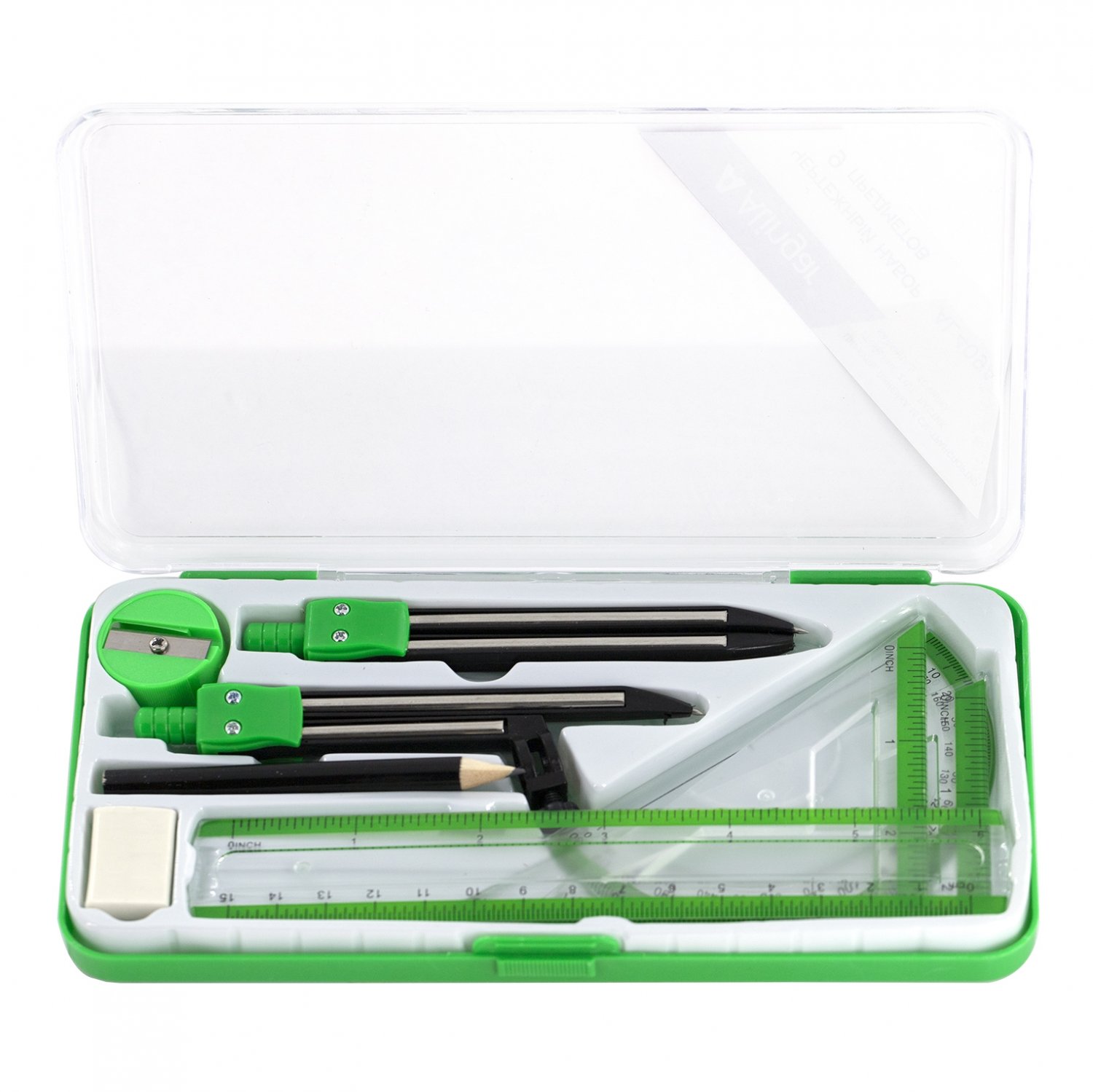 Готовальня включает 9 предметов. Все металлические детали чертежных инструментов выполнены из высококачественной прочной стали и надежно скреплены между собой.