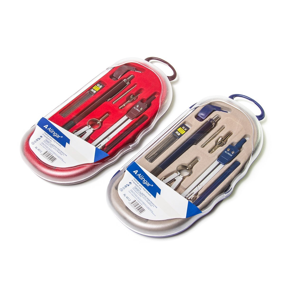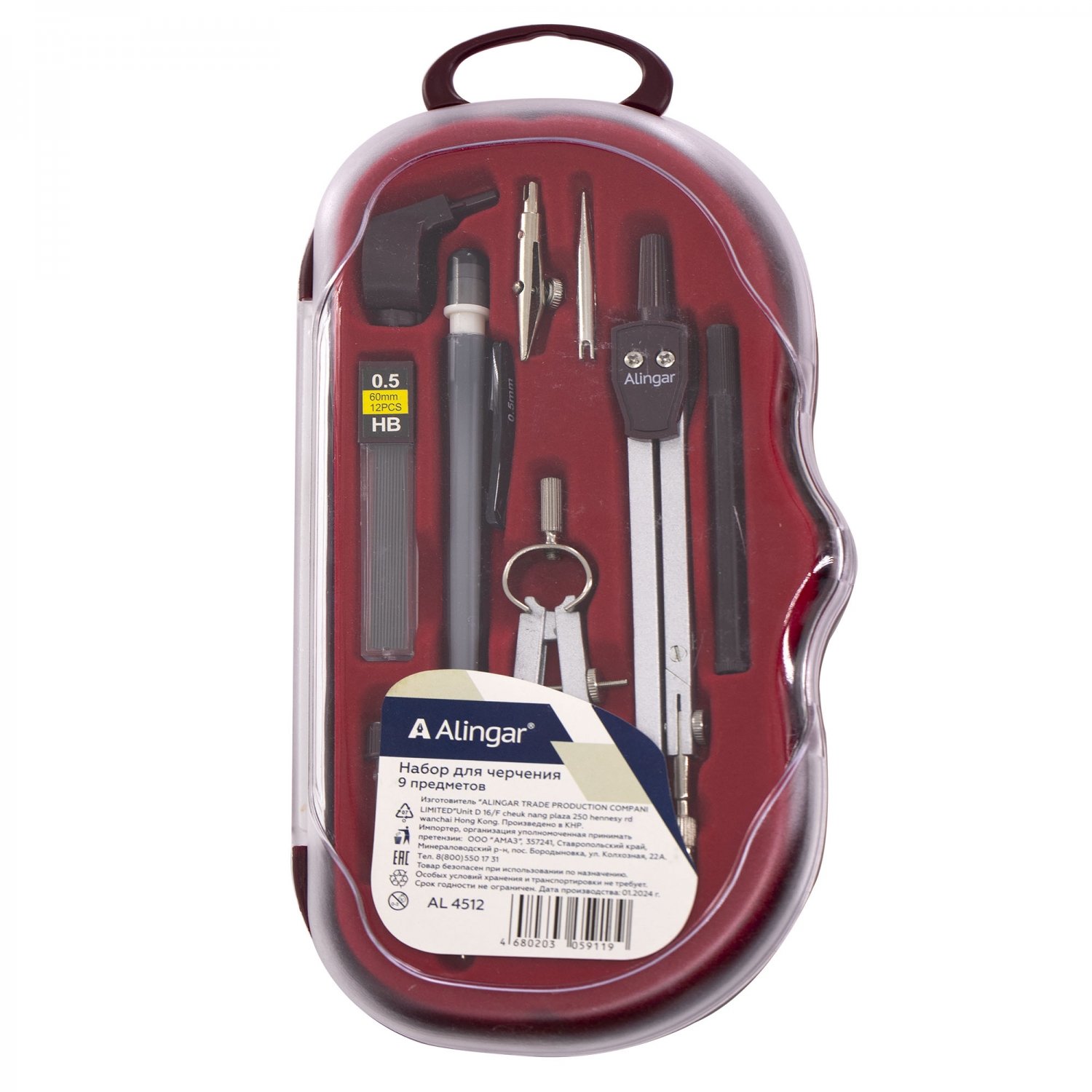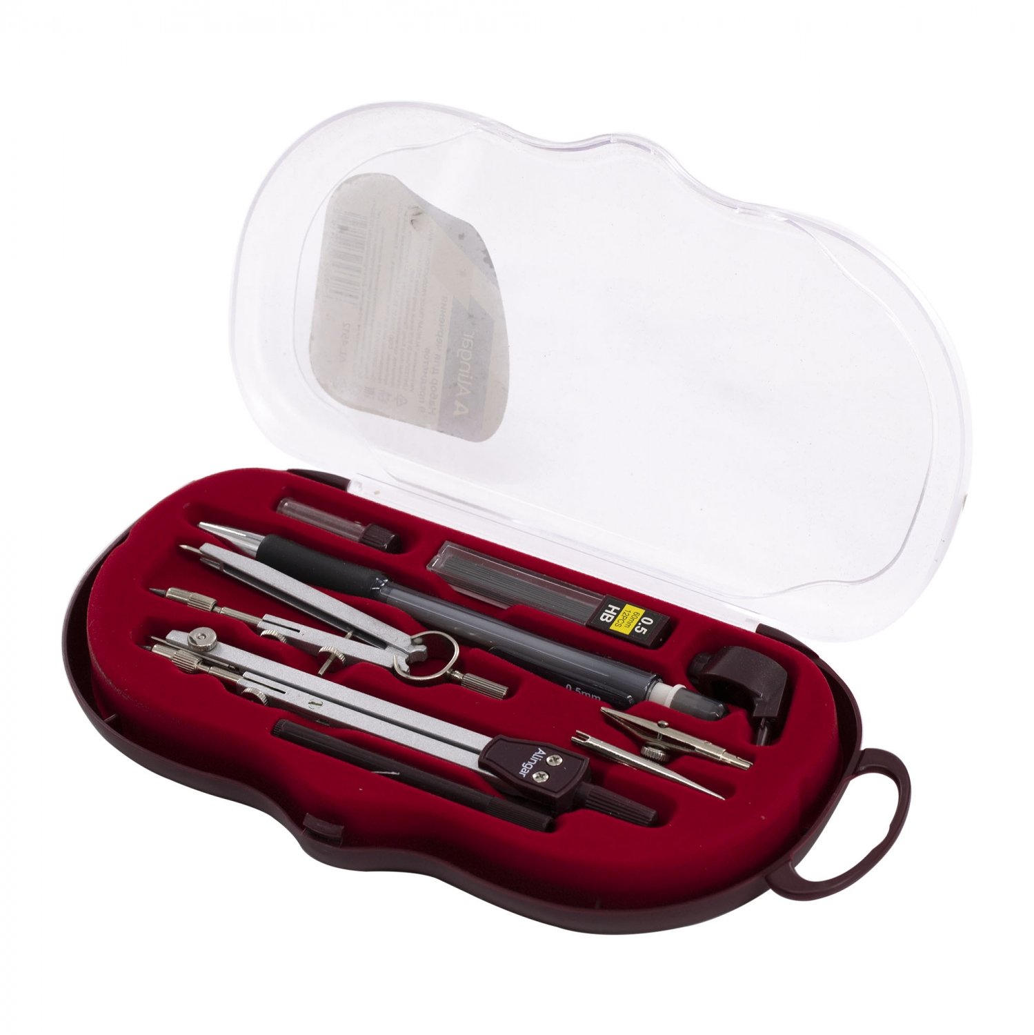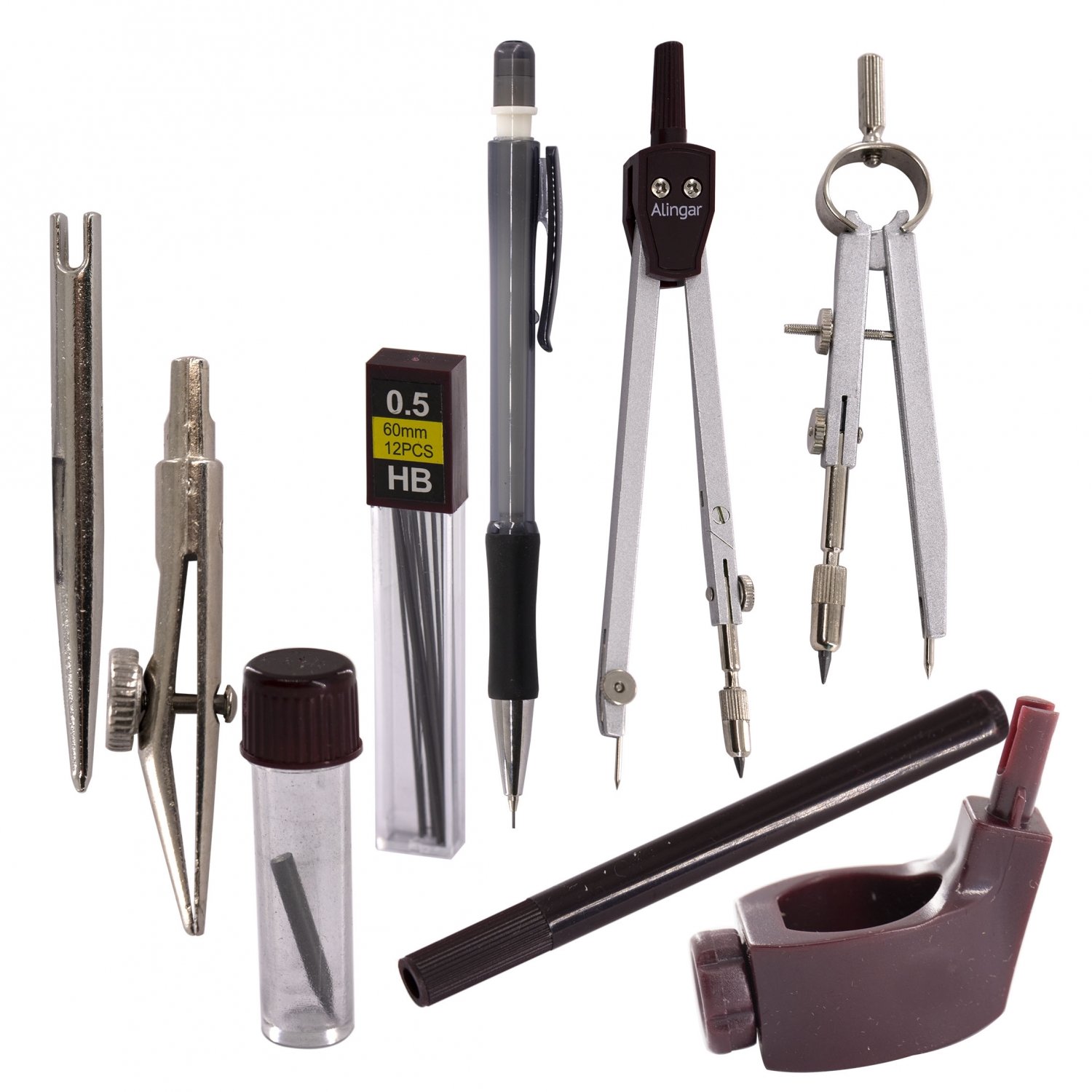 Набор чертежных принадлежностей из 9 предметов включающий в себя: металлический циркуль с пластиковым держателем 105 мм, циркуль-балеринка 60 мм, насадка-кронциркуль, рейсфедер, пластиковый держатель рейсфедера, насадка для крепления карандаша, механический карандаш 0,5 мм, запасной грифель 2мм в контейнере, запасные грифели 0,5 мм в контейнере.