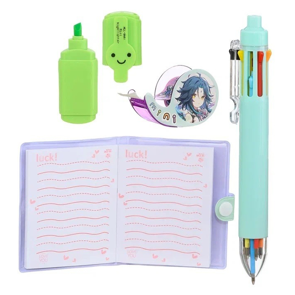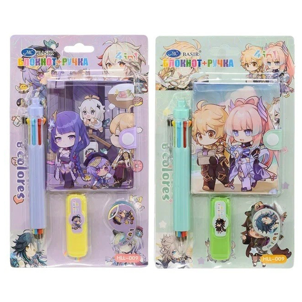 Набор подарочный канцелярский: детский "АНИМЕ"; блокнот на кнопке /10,3*7 см/+8-ми цветная авторучка+мини текстмаркер+диспенсер с детским скотчем, яркая упаковка-блистер на подложке с европодвесом /22*13 см/. В коробке 144 шт.