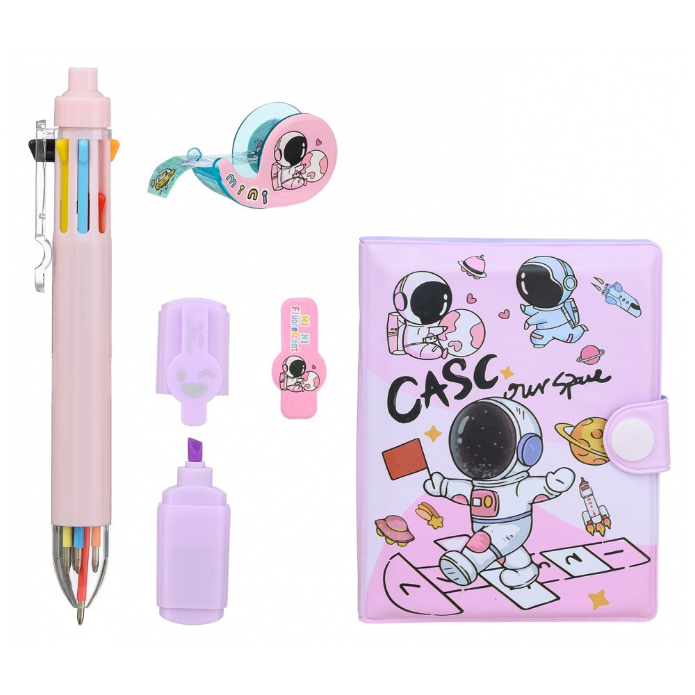 Набор подарочный канцелярский: детский "КОСМОС"; блокнот на кнопке /10,3*8 см/+8-ми цветная авторучка+ мини текстмаркер+ диспенсер с детским скотчем, яркая упаковка-блистер на подложке с европодвесом /22*13 см/. В коробке 144 шт.