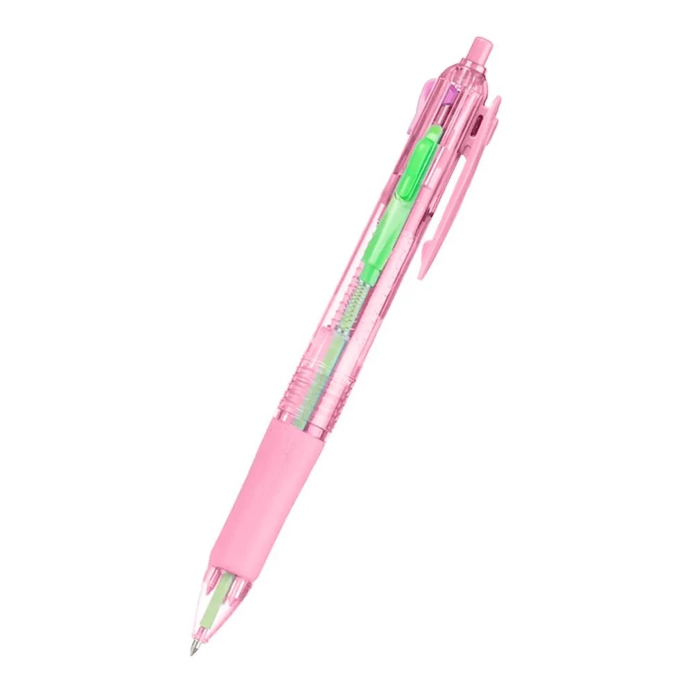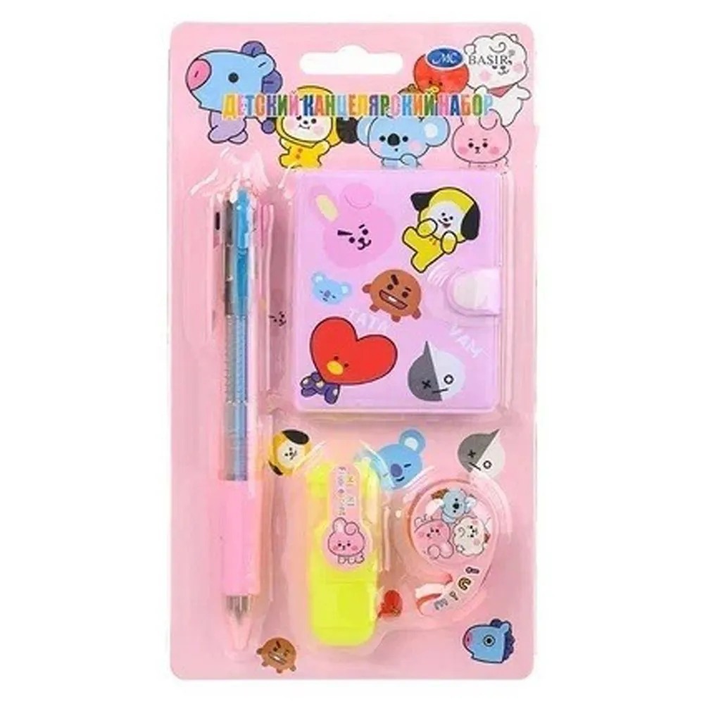 В подарочный канцелярский набор от компании MC-Basir входит 3-х цветная ручка с розовым корпусом, мини текстовыделитель (цвет может быть разным), мини блокнот детский на кнопке и диспенсер для скотча со скотчем внутри.
