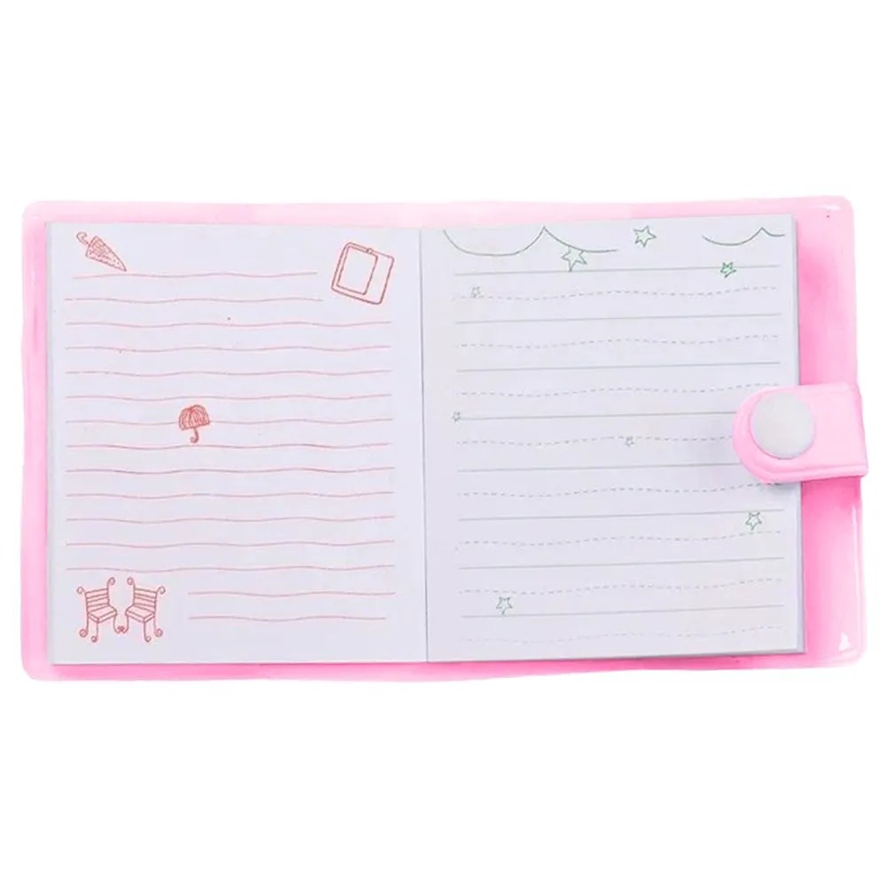 Размер мини блокнота в наборе канцелярских предметов составляет 70 x 60 мм и имеет линовку в мелкую волнистую линейку.