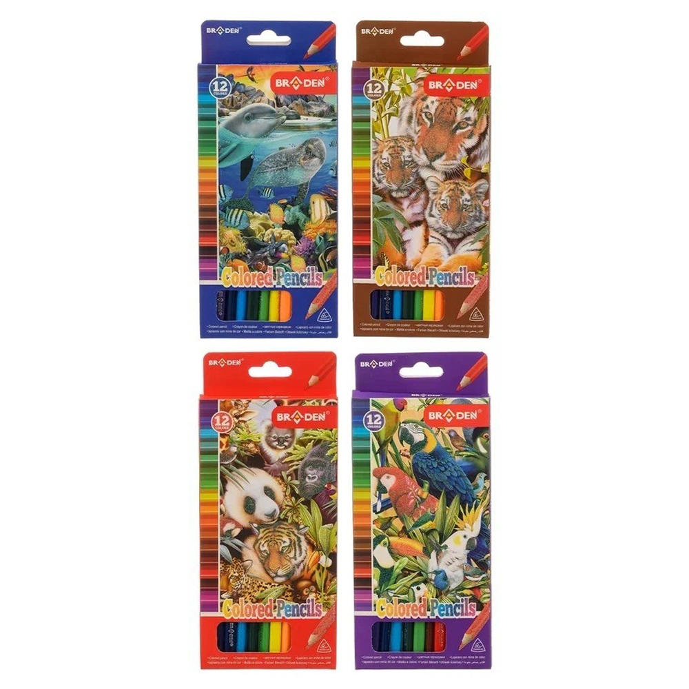 Набор цветных карандашей: "Животный Мир"; деревянные; корпус треугольной формы; яркая упаковка с рисунком и блёстками /ассорти/; 12 цветов.
