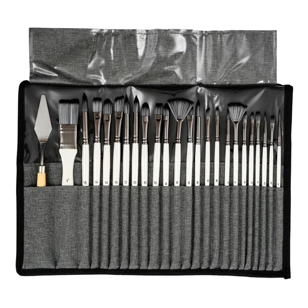 Набор кистей: состоит из 24 художественных кистей и 1 шпателя, кисти располагаются в удобном чехле /размер чехла 36*26 см/ (круглые, плоские ); изготовленных из нейлона, древко жемчужного цвета.