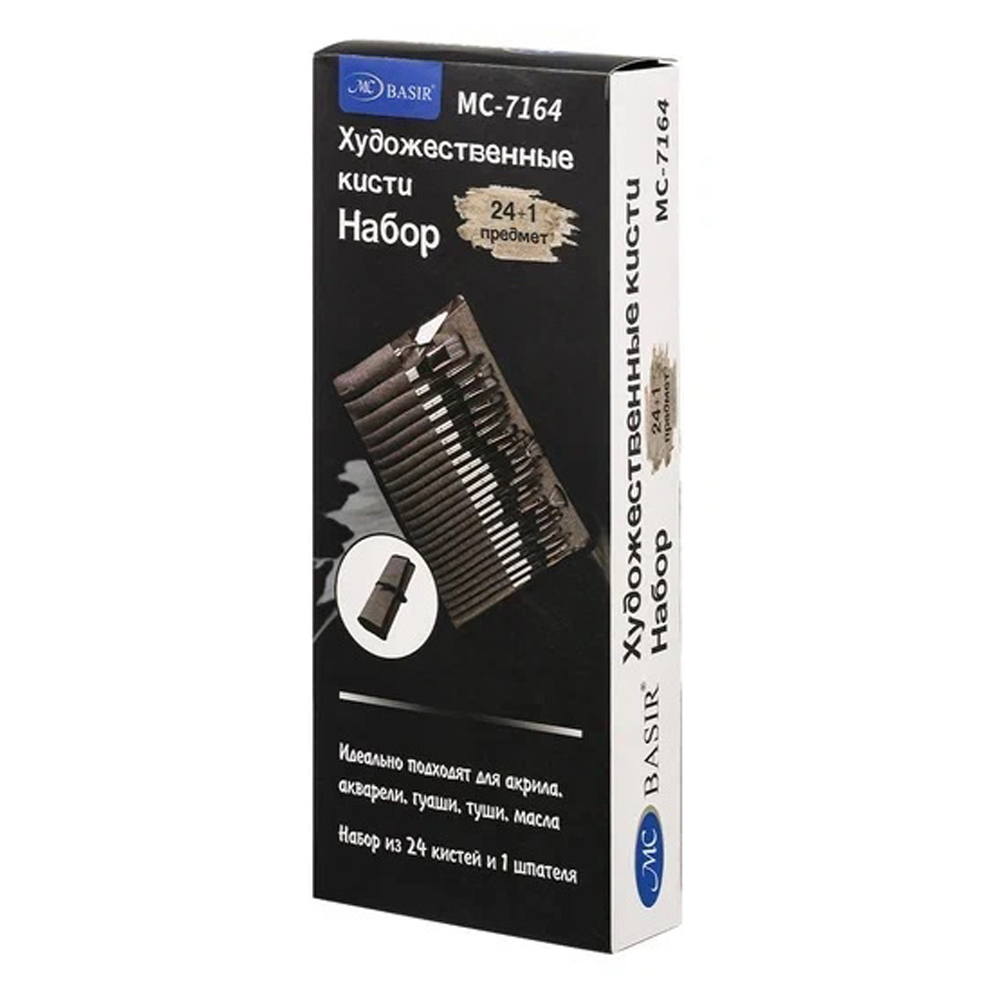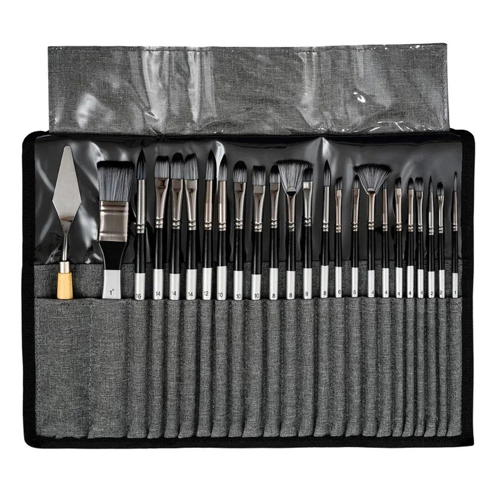 Набор кистей: состоит из 24 художественных кистей и 1 шпателя, кисти располагаются в удобном чехле /размер чехла 36*26 см/ (круглые, плоские, .. ); изготовленных из нейлона, древко серебристого цвета.