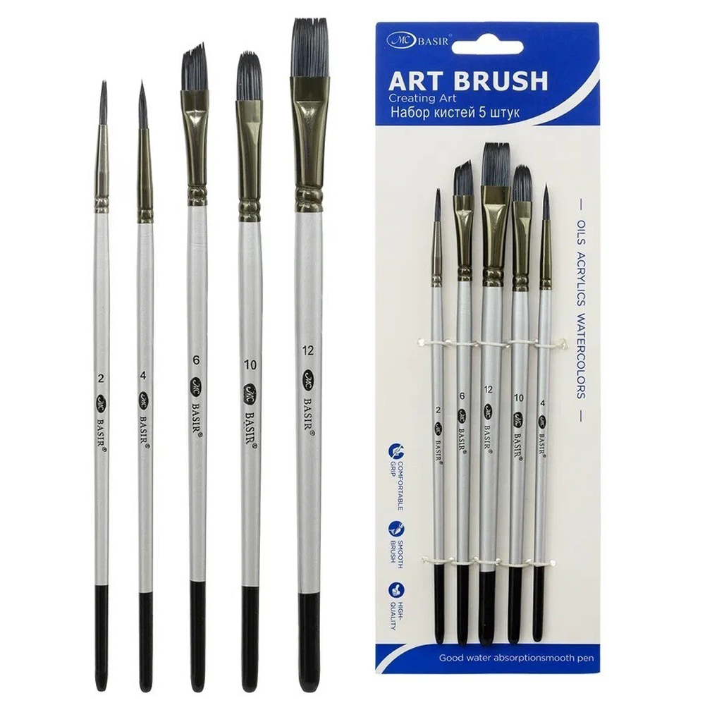 Набор кистей: состоит из 5 художественных кистей (плоские, круглые);№2,4,6,10,12,держатель лакированное дерево серебро, изготовленных из синтетики.
