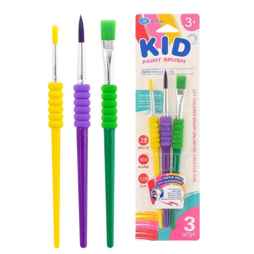 Набор кистей: состоит из 3 художественных кистей ( плоские, круглые№2,12,10), изготовленных из нейлона, цветные, с фигурным мягким держателем для пальцев.