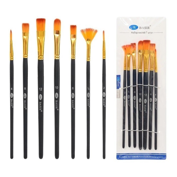 Набор кистей: состоит из 7 художественных кистей (круглые и плоские №2,3/0,4,6,8,10,12), изготовленных из нейлона.