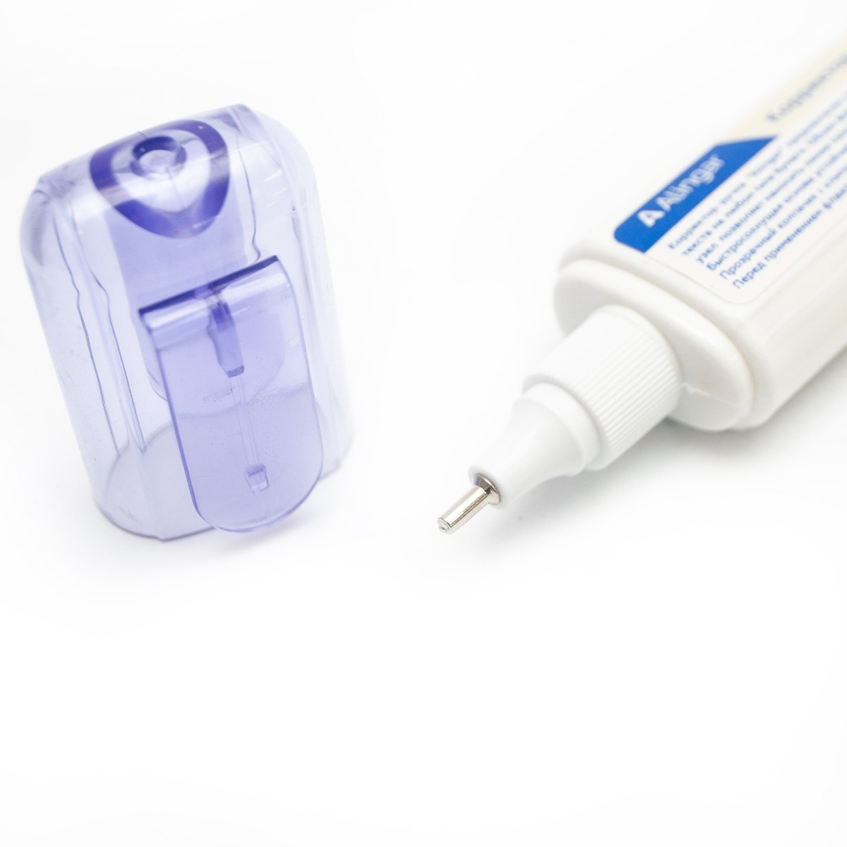 Ручка с корректирующей жидкостью поможет вам аккуратно удалить ошибки и опечатки. Корпус выполнен из эластичного пластика. Тонкий шариковый металлический наконечник обеспечивает точность исправлений. Жидкость быстро сохнет, мягко ложится на бумагу, обеспечивая гладкое ровное покрытие. Шарик внутри корпуса ручки помогает равномерно размешать жидкость перед использованием. Удобный колпачок с клипом предотвращается преждевременное высыхание абсорбирующих чернил.