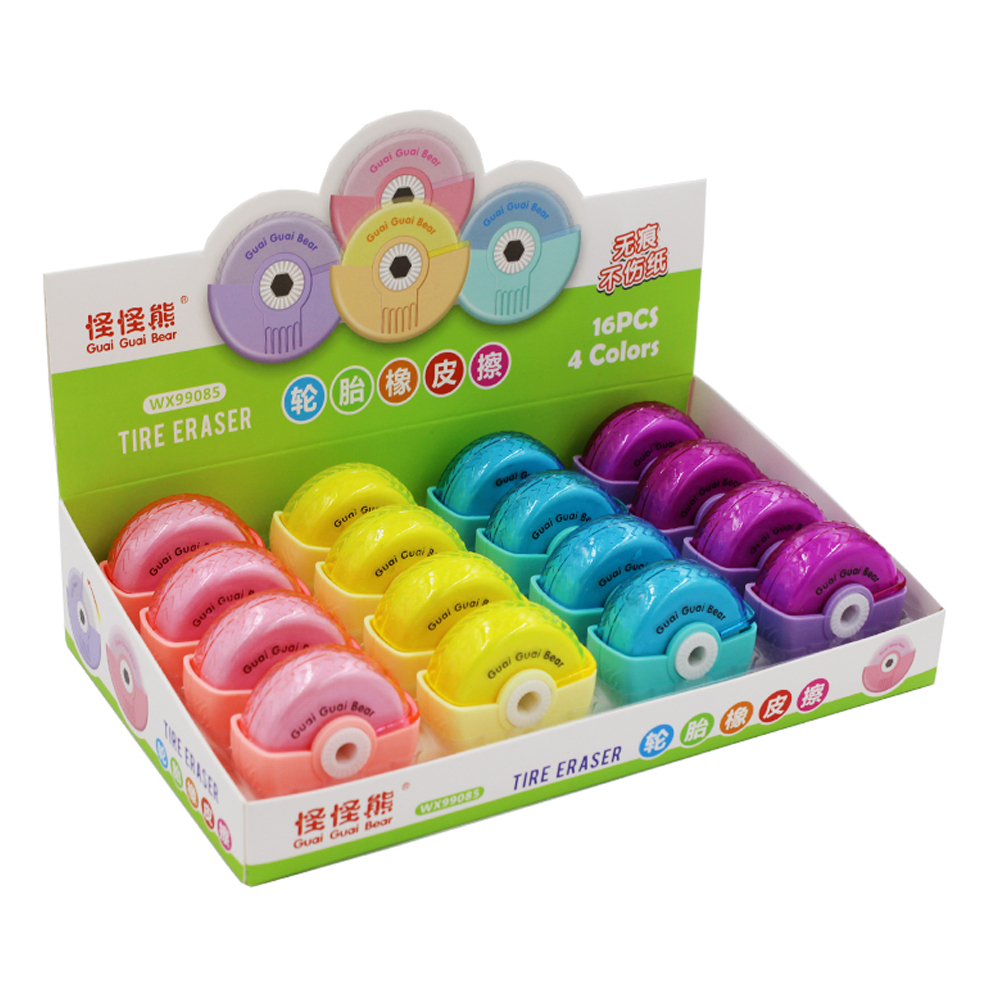 Ластик: "КОЛЕСО"; пластмассовый контейнер с крышкой, выполнен в форме колеса, ластик белый, корпус цветной /ассорти/, размер диаметр 5 см. Количество в упаковке: 640 штук.