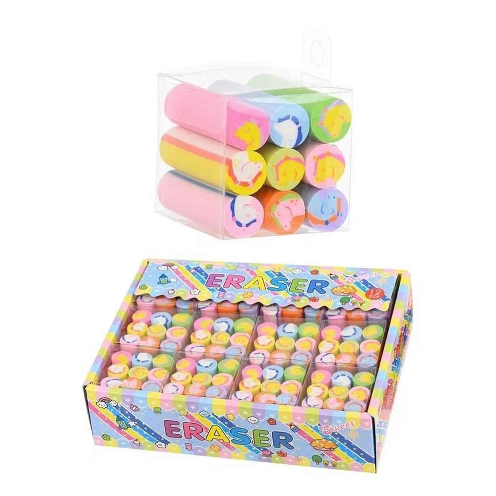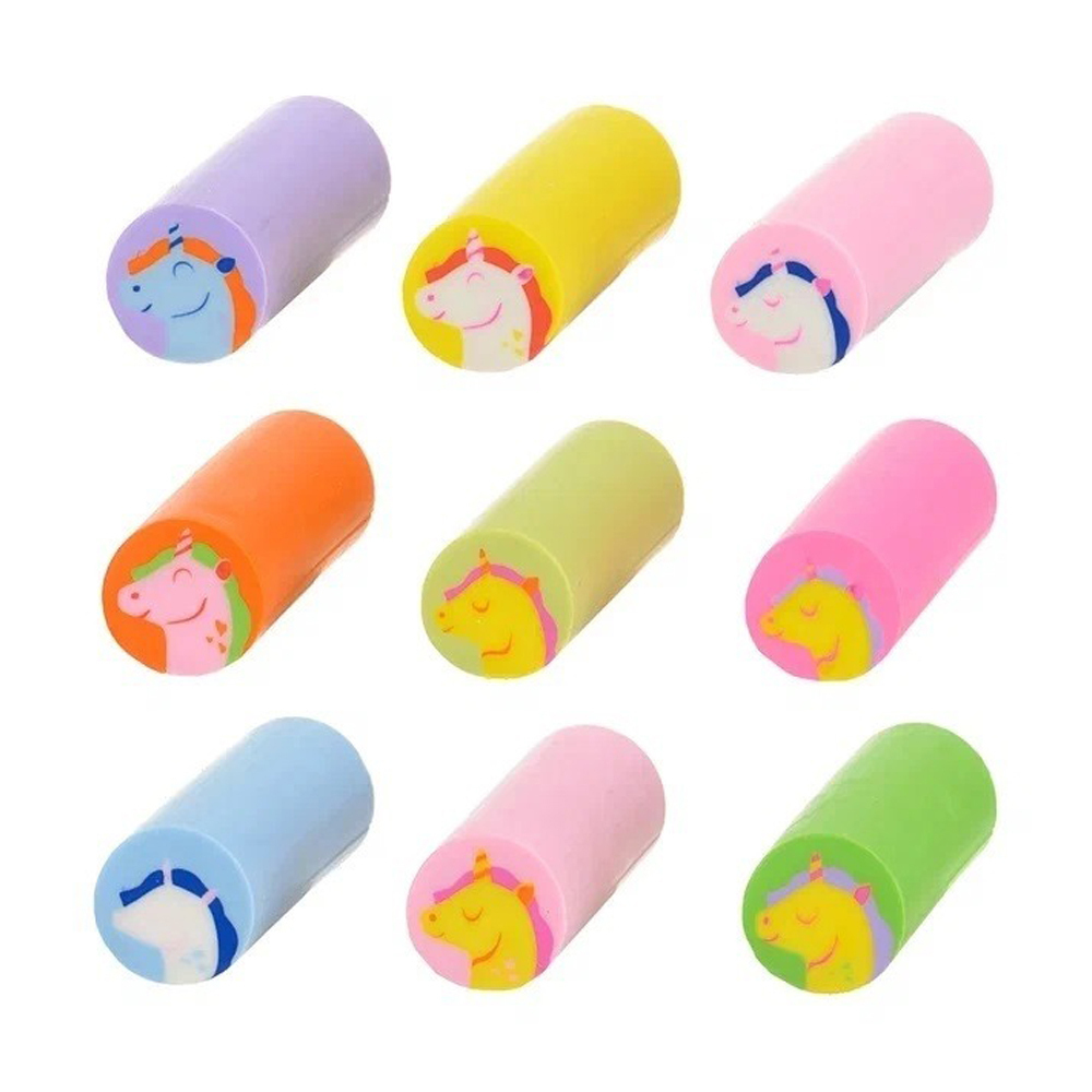 Ластик: "ЕДИНОРОГ"; мягкий, цветной, цилиндрической формы с рисунком /ассорти/, в пластиковой упаковке по 9 штук, размер 4,8*1,4 см. Количество в упаковке: 108 шт.
