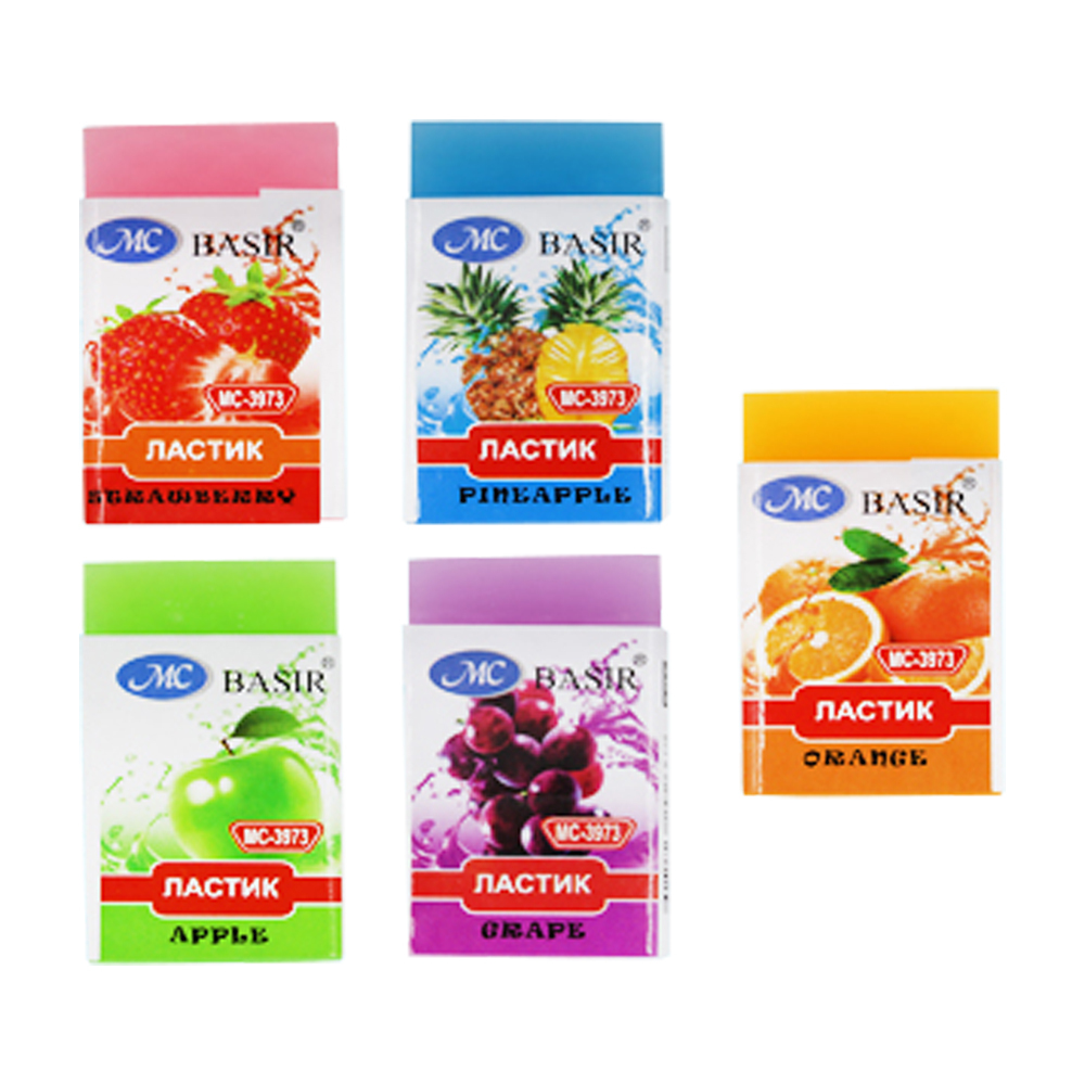 Ластик: "Фрукты"; яркий, цветной /ассорти/, прямоугольной формы, размер 4,0*2,4 см. Количество в упаковке: 2400 штук.