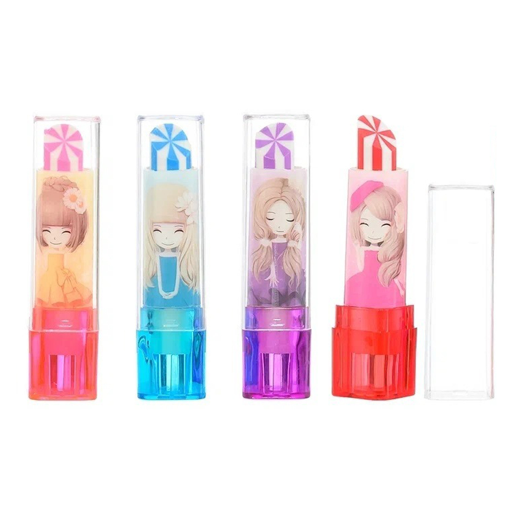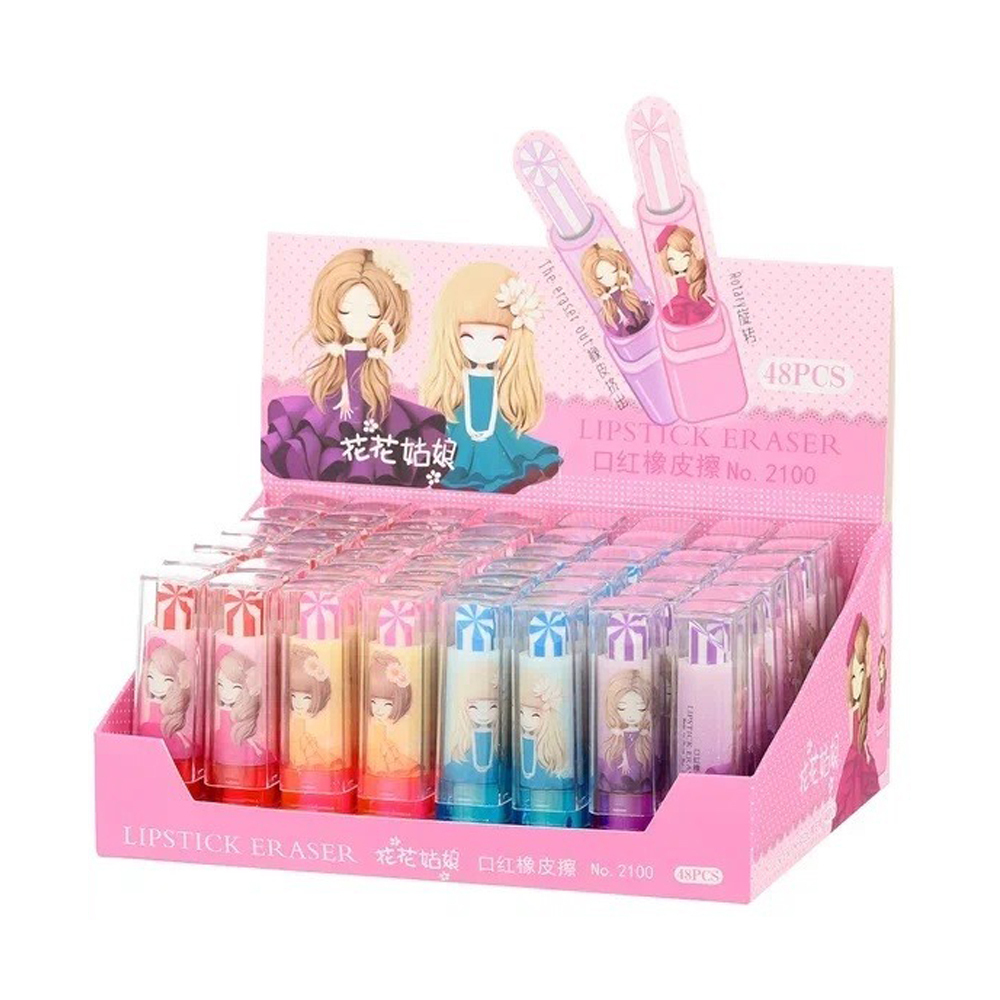 Ластик: "ПОМАДА"; выполнен в форме помады в пластиковом футляре с рисунком-аниме /имитация помады/; размер 7,5 см. Количество в упаковке: 48 штук.