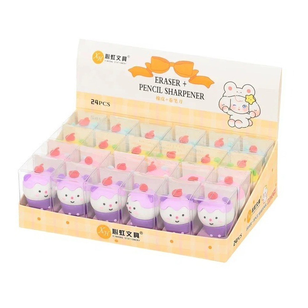 Точилка+ластик: "ЧЕЛОВЕЧЕК"; выполнен в форме человечка в шапке, цветной /ассорти/, размер 4*3,1 см, в пластиковой упаковке /6*3,*3,4 см/. Количество в упаковке: 24 штуки.
