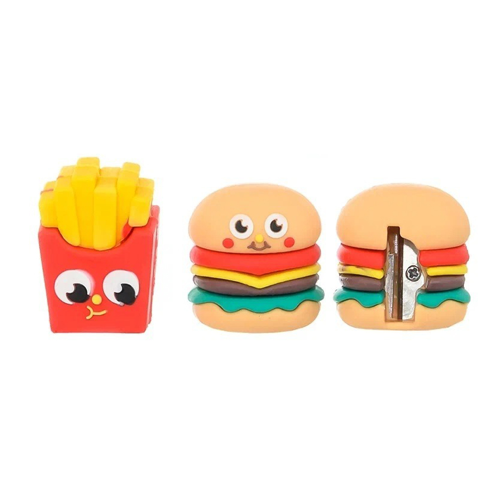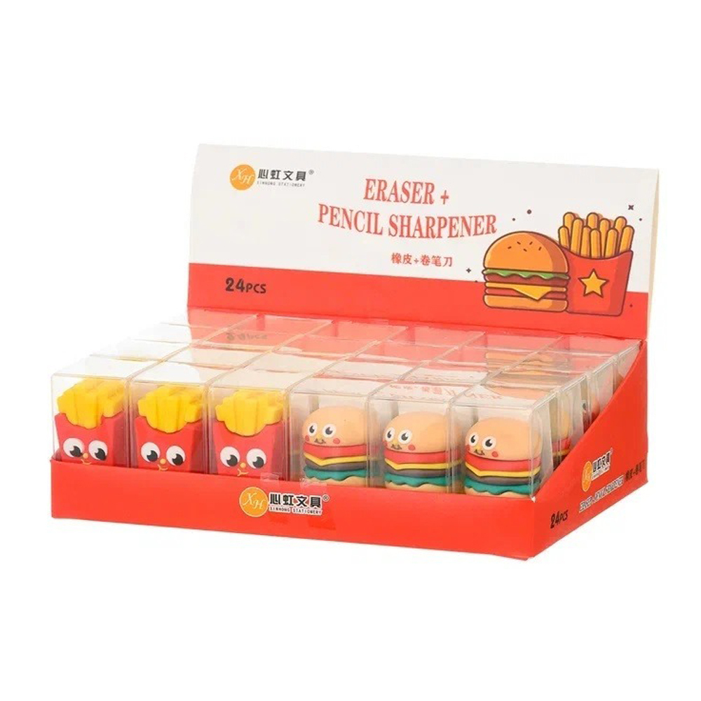 Точилка+ластик: "Фаст-Фуд"; выполнен в форме бургера, картошки фри, цветной /ассорти/, размер 3,8*2,5 см, в пластиковой упаковке /6*3*3,4 см/. Количество в упаковке: 24 штуки.