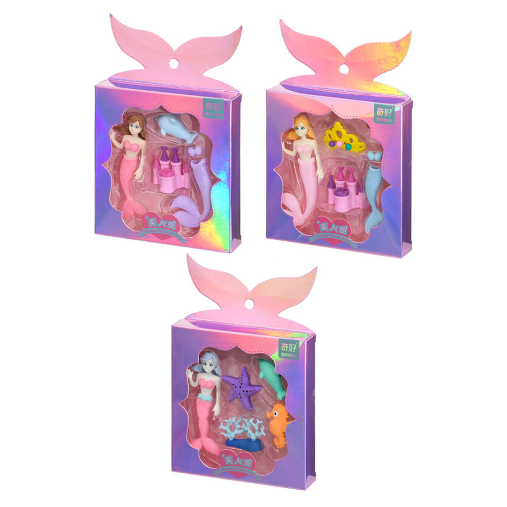 Ластик-игрушка /конструктор/: "РУСАЛОЧКА"; выполнен в форме русалочки, ракушек, замка и т.д./ассорти/, в подарочной упаковке с европодвесом /14*13 см/ по 5 и более шт. Количество в коробке: 144 штук.