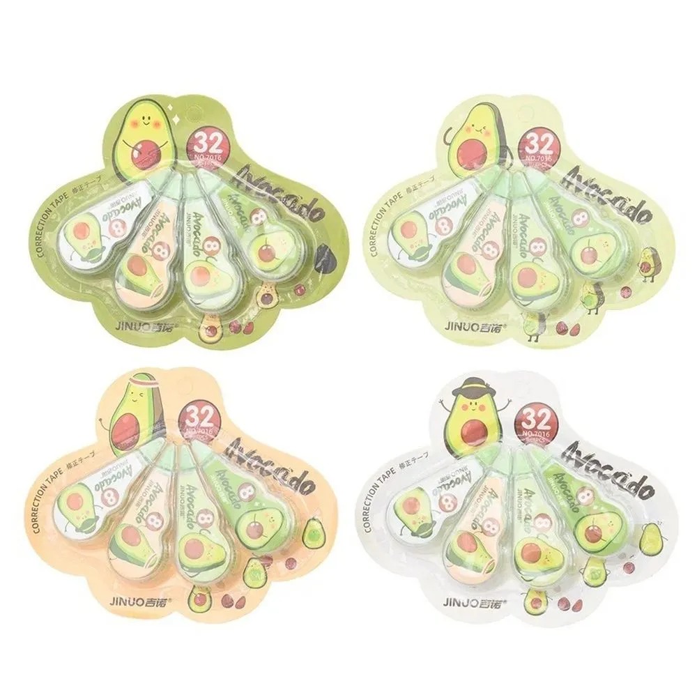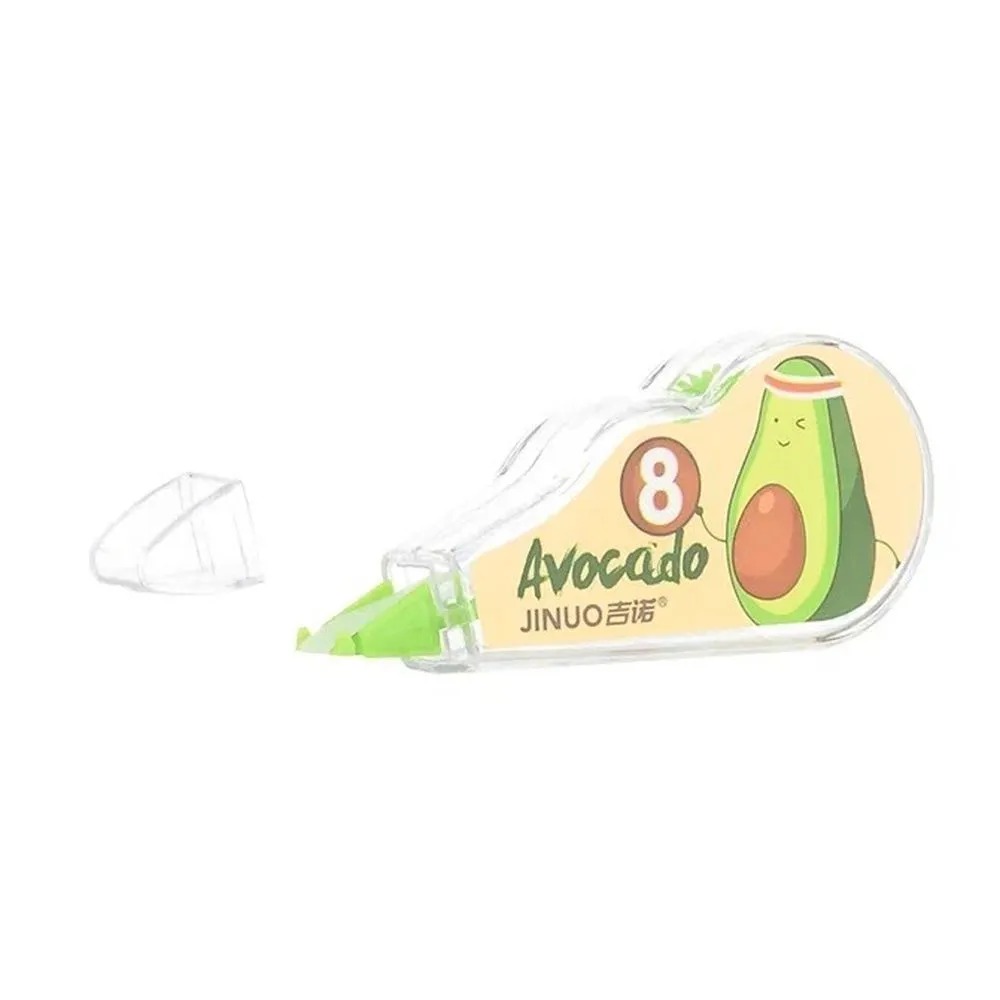 Краска корректор для письма роликовый от компании JINUO производится в корпусе зелёного, розового и белого цвета с рисунком авокадо. Он необычайно легкий и компактный, а также к плюсам ленточной замазки можно отнести возможность смены модуля с корректирующим роликом.