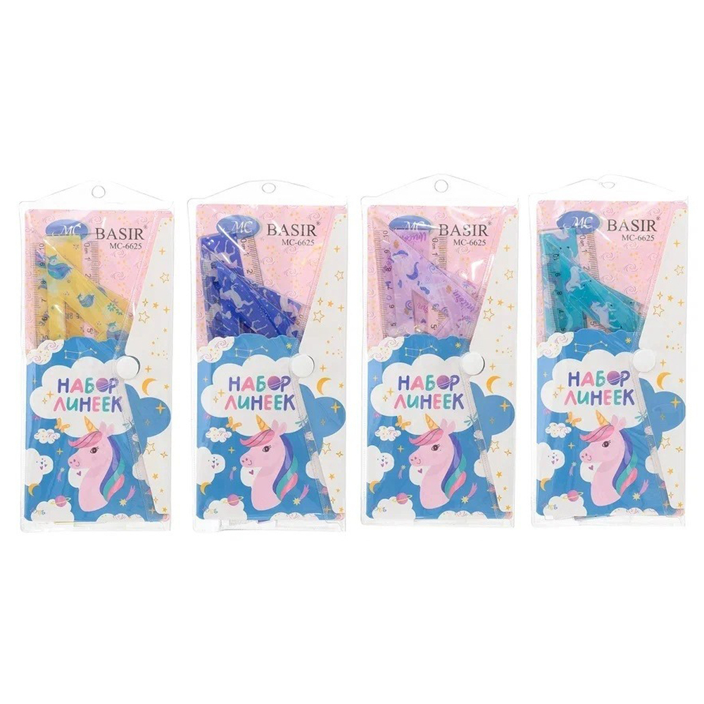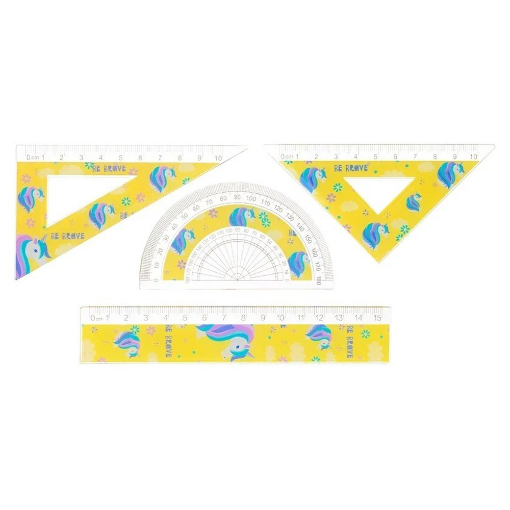 Набор линеек: "ЕДИНОРОГ"; 4 предмета: пластиковые с рисунком; 2 треугольника, транспортир, линейка 15 см; упаковка ПВХ-конверт на кнопке. В упаковке: 40 шт.