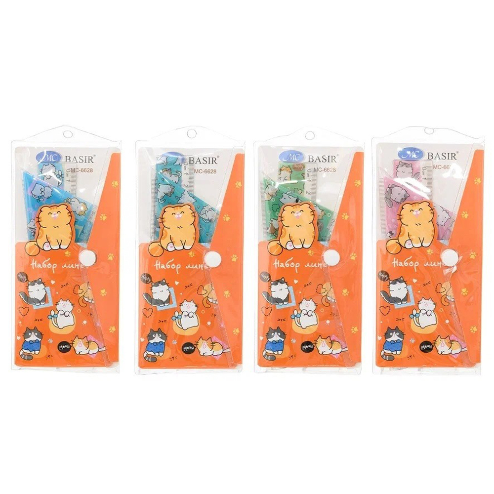 Набор линеек: "КОШКА"; 4 предмета: пластиковые с рисунком; 2 треугольника, транспортир, линейка 15 см; упаковка ПВХ-конверт на кнопке. В упаковке: 40 шт.