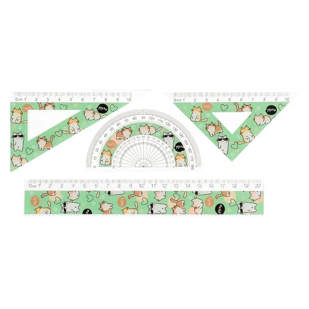 Набор линеек: "КОШКИ"; 4 предмета: пластиковые с рисунком; 2 треугольника, транспортир, линейка 20 см; упаковка ПВХ-конверт на кнопке. В упаковке: 40 шт.