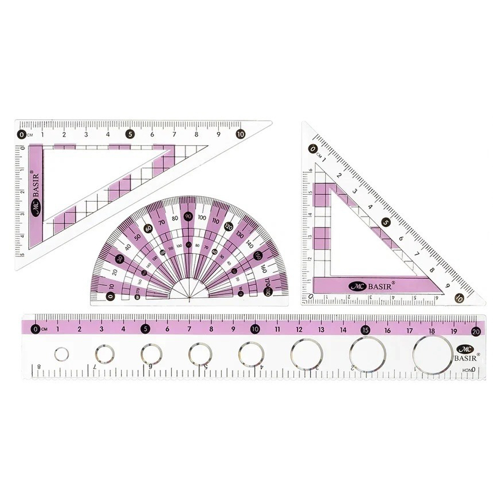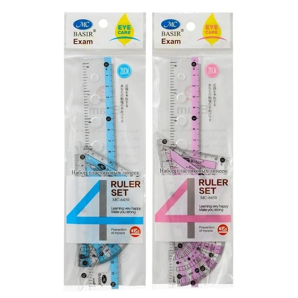 Набор линеек: 4 предмета: пластиковые, прозрачные с цветными вставками; 2 треугольника, транспортир, линейка с трафаретом 20 см; в п/э упаковке. Количество набор в коробке: 800 шт.