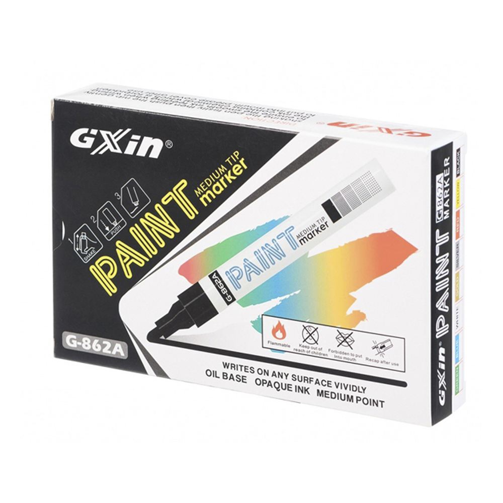 Маркер-краска: на масляной основе, белый цвет. Маркер-краска Gixin (лаковый маркер) - профессиональный лаковый маркер на нитрооснове. Маркер-краска Gixin пишет на всех типах поверхностей: металл, дерево, резина, бетон, стекло, кожа. Диаметр пишущего узла - 4 мм. Paint Marker подходит для реставрации дефектов на бытовой технике, обуви, кузове автомобиля, а также надписей на каменных плитах. Маркер-краска Gixin имеет широкое применения в дизайне, декорировании и оформлении. Корпус маркера изготовлен из прочного алюминия. Клапанный механизм пишущего узла исключает растекание и разбрызгивание краски, преждевременное пересыхание маркера, срок годности 5 лет. Благодаря высококачественным чернилам, краска ложиться на поверхность равномерным и однородным слоем, полностью закрашивая обрабатываемую поверхность, быстро сохнет. После высыхания, надписи обладают свето- и водостойкостью, термостойкостью, устойчивостью к механическим воздействиям.Инструкция по применению:1) Встряхнуть маркер с закрытым колпачком. 2) Открыть колпачок. Удерживая маркер в вертикальном положении, несколько раз надавить стержнем на поверхность до тех пор, пока краска не поступит на пишущих узел. 3) Выполнить надпись или рисунок. Дать составу высохнуть в течение 40-60 секунд. 4) Плотно закрыть колпачок. В транспортировочной коробке 48 упаковок.