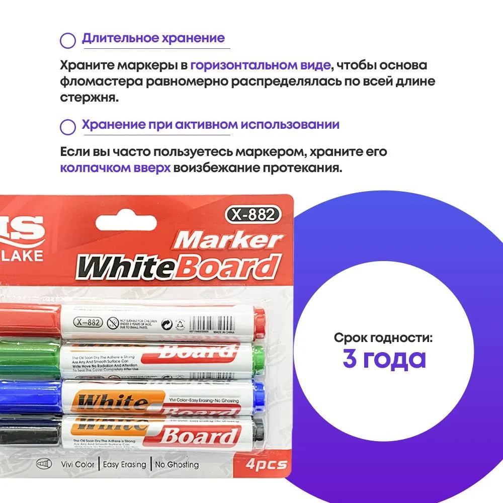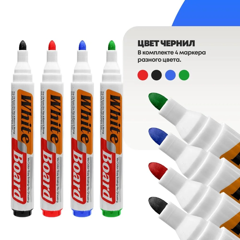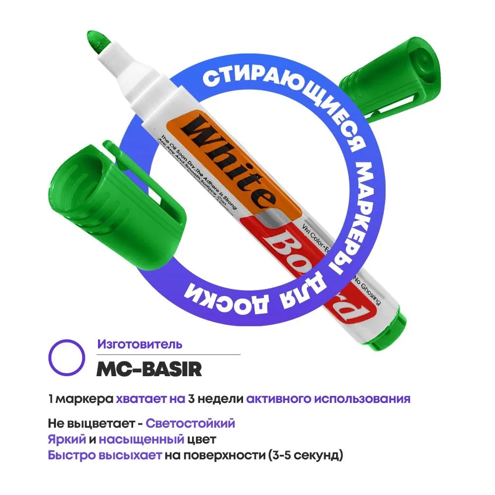 Маркеры для доски, стираемые от компании MC-Basir предназначены для использования на изделиях с магнитно-маркерной поверхностью. Набор маркеров для белых досок идеально подходит для рисования, игр, визуализации учебных процессов, учебы, совещаний, проведения планерок. Данные фломастеры можно использовать также на флипчартах. Наконечник стираемого маркера для доски круглый пулевидный. Пластиковый корпус приятный на ощупь и хорошо сидит в руке. Толщина линии письма: 2 мм, что позволяет писать крупным шрифтом, который будет хорошо виден.В набор маркеров для доски входит 4 маркера 4-х цветов: черный, синий, красный, зеленый. Внимание! Маркер для белой доски стираемый необходимо хранить в горизонтальном положении или фетром вниз. Основа чернил маркера для белой доски - спиртовая. Чернила быстро высыхают и легко стираются сухой губкой, не оставляя разводов. Изделие не перезаправляется. Цвет колпачка с клипом соответствует цвету чернил.