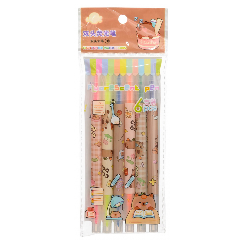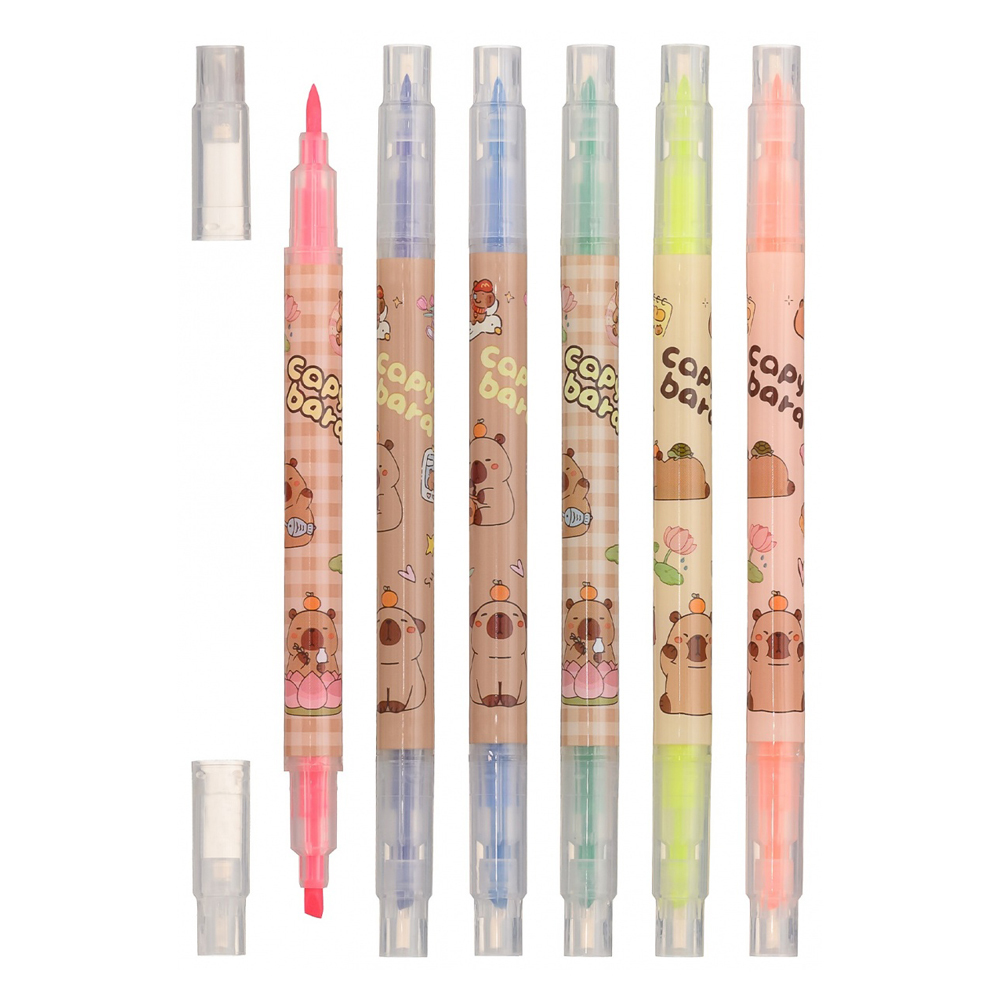 Набор текстмаркеров: "КАПИБАРА"; двусторонние, цветной корпус с рисунком, размер маркера 15 см, 6 цветов. Количество в коробке: 480 наборов.