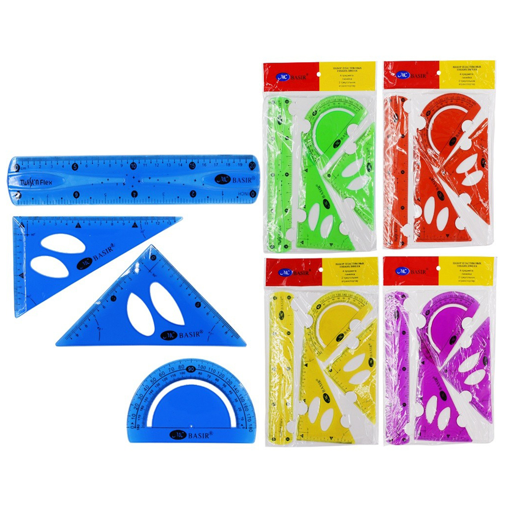 Набор пластиковых гибких линеек: цветные, 4 предмета: транспортир, 2 треугольника, линейка 20 см. В коробке 192 набора.