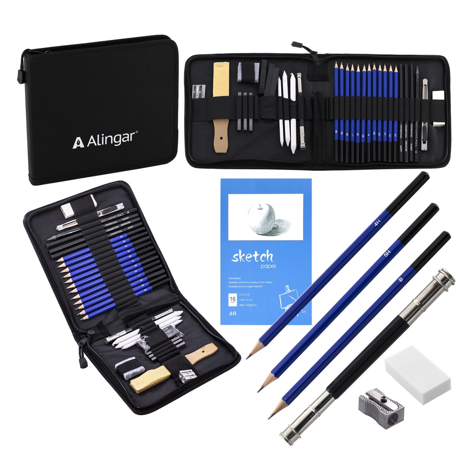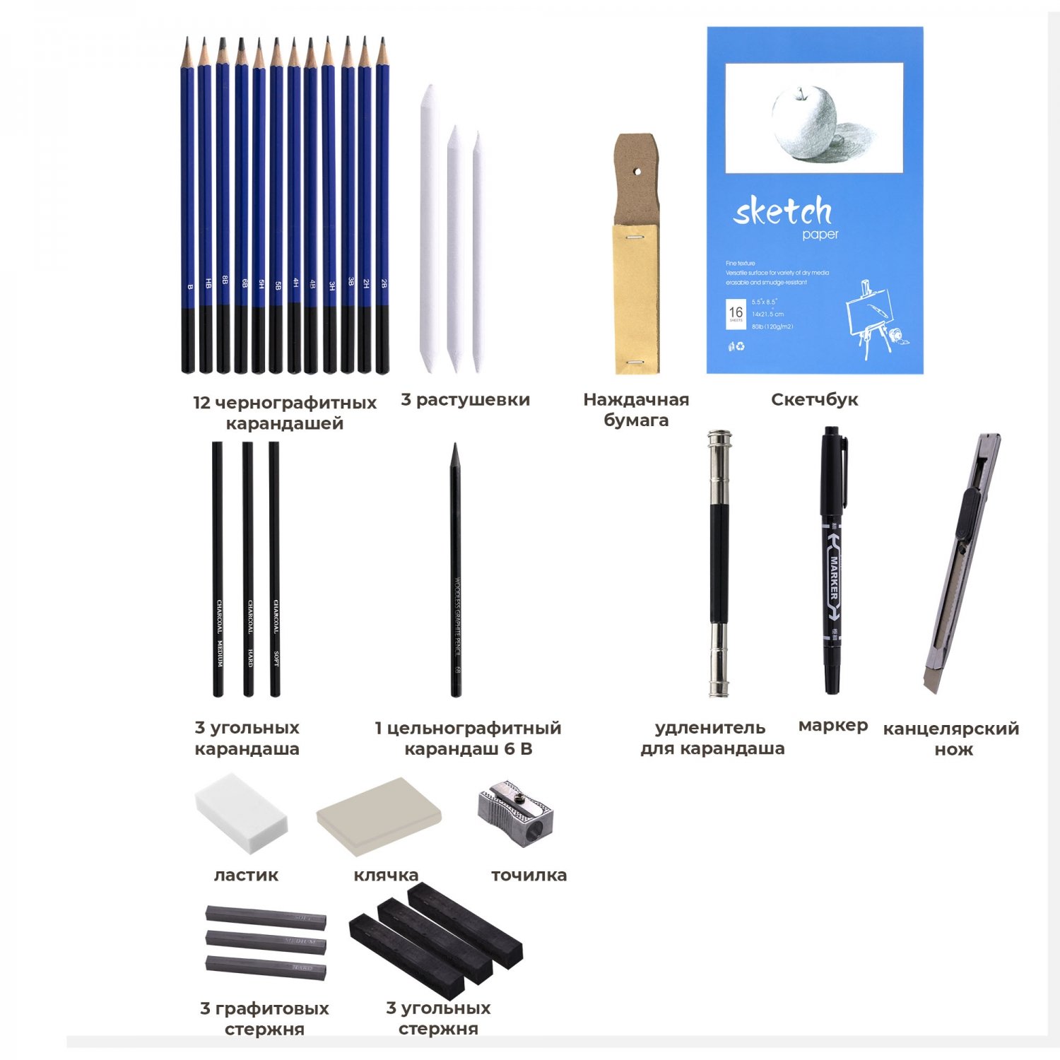 Представляем большой набор чернографитных простых карандашей в пенале для художников. Будь вы профессиональным или начинающим художником, либо просто любителем, набор для рисования является необходимым инструментом для вашего творчества. Комплект состоит из 12 качественных чернографитных карандашей разной твердости и мягкости (твердые и мягкие 5H 4H 3H, 2H (Т), HB (ТМ), B , 2B, 3B, 4B, 5B, 6B, 8B (М)) , позволяя вам создавать рисунки с разными оттенками и текстурами. Мягкий графит позволит легко и плавно, тонко провести каждую линию, придавая вашим работам особое выражение и глубину. Эта канцелярия идеально подходят для рисования, черчения, создания макетов. Благодаря шестигранной форме, обычные чернографитовые карандаши легко ложатся в руку, обеспечивая комфортное рисование. В творческих наборах для скетчинга есть все инструменты для рисования: растушевки, наждачная бумага, угольные карандаши, графитовый (монолит) карандаш, 3 графитовых и 3 угольных бруска (soft, medium, hard), канцелярский нож, металлическая точилка, клячка, ластик, 2 сторонний удлинитель - держатель, скетчбук. Канцелярские художественные товары в портативном пенале на замке