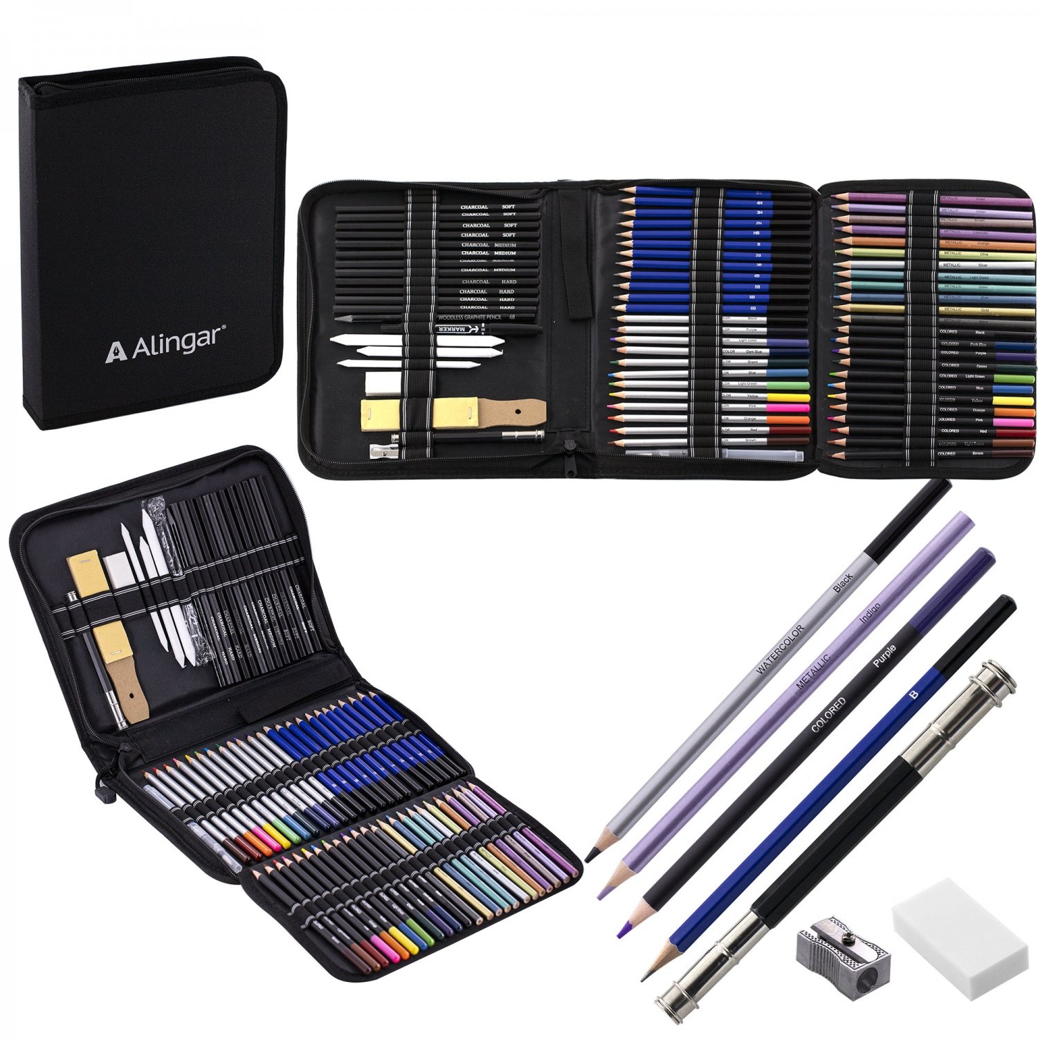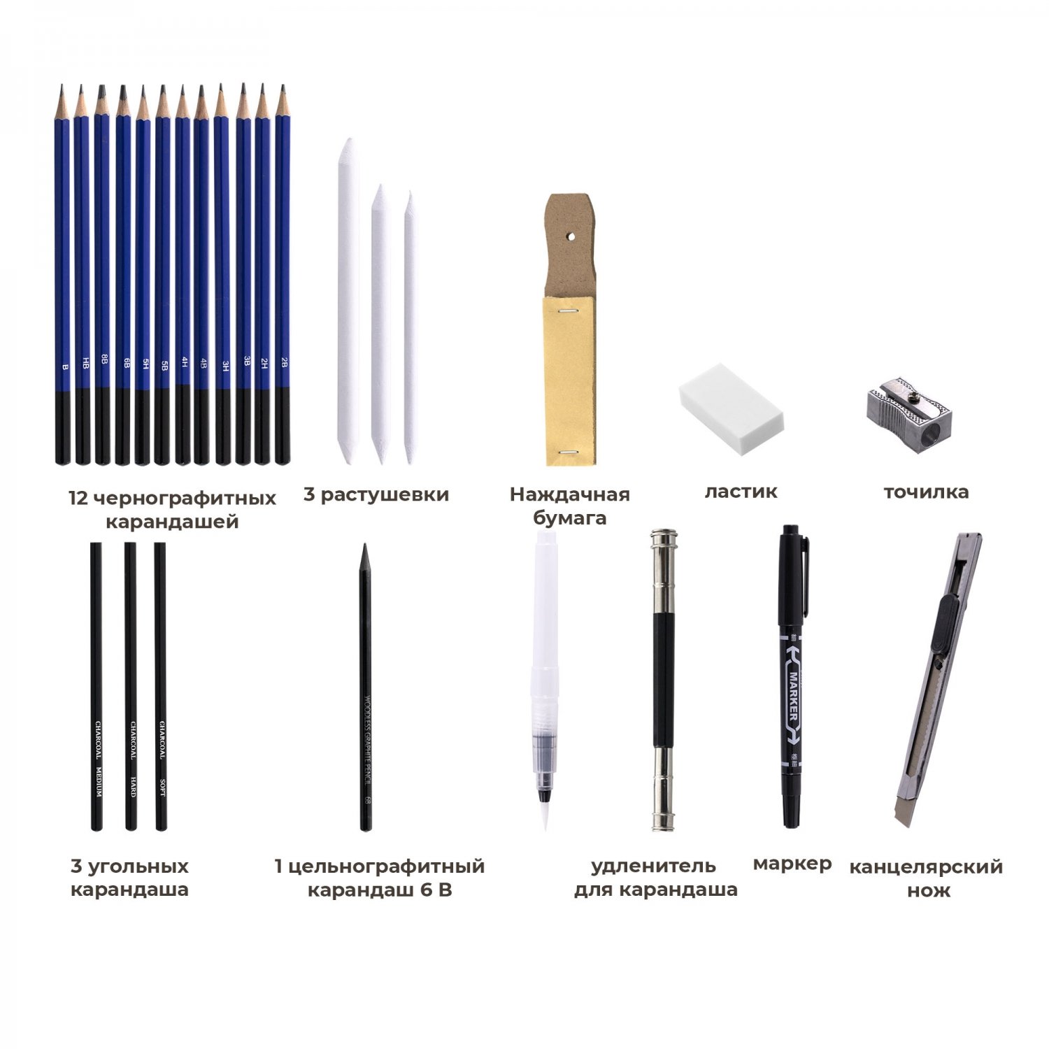 Представляем большой набор карандашей в пенале для художников. Будь вы профессиональным или начинающим художником, либо просто любителем, набор для рисования является необходимым инструментом для вашего творчества. Комплект состоит из 36 цветных карандашей ( 12 акварельных, 12 металик, 12 цветных), 12 качественных чернографитных карандашей разной твердости и мягкости (твердые и мягкие 5H 4H 3H, 2H (Т), HB (ТМ), B , 2B, 3B, 4B, 5B, 6B, 8B (М)), 12 уголных карандашей (soft, medium, hard), позволяя вам создавать рисунки с разными оттенками и текстурами. Мягкий графит позволит легко и плавно, тонко провести каждую линию, придавая вашим работам особое выражение и глубину. Эта канцелярия идеально подходят для рисования, черчения, создания макетов. В творческих наборах для скетчинга есть все инструменты для рисования: растушевки, наждачная бумага, угольные карандаши, графитовый (монолит) карандаш, металлическая точилка, ластик, 2 сторонний удлинитель - держатель, маркер, кисть с резервуаром, канцелярский нож. Канцелярские художественные товары в портативном пенале на замке