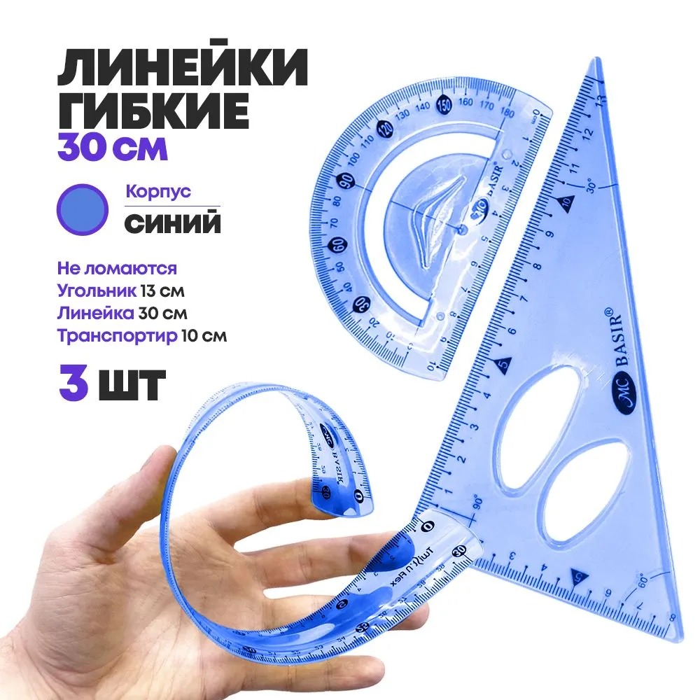 В набор гибких пластиковых линеек от компании MC-Basir входят 3 линейки: 1 большая линейка, 1 канцелярская линейка угольник с острым углом, 1 линейка транспортир с градусами.