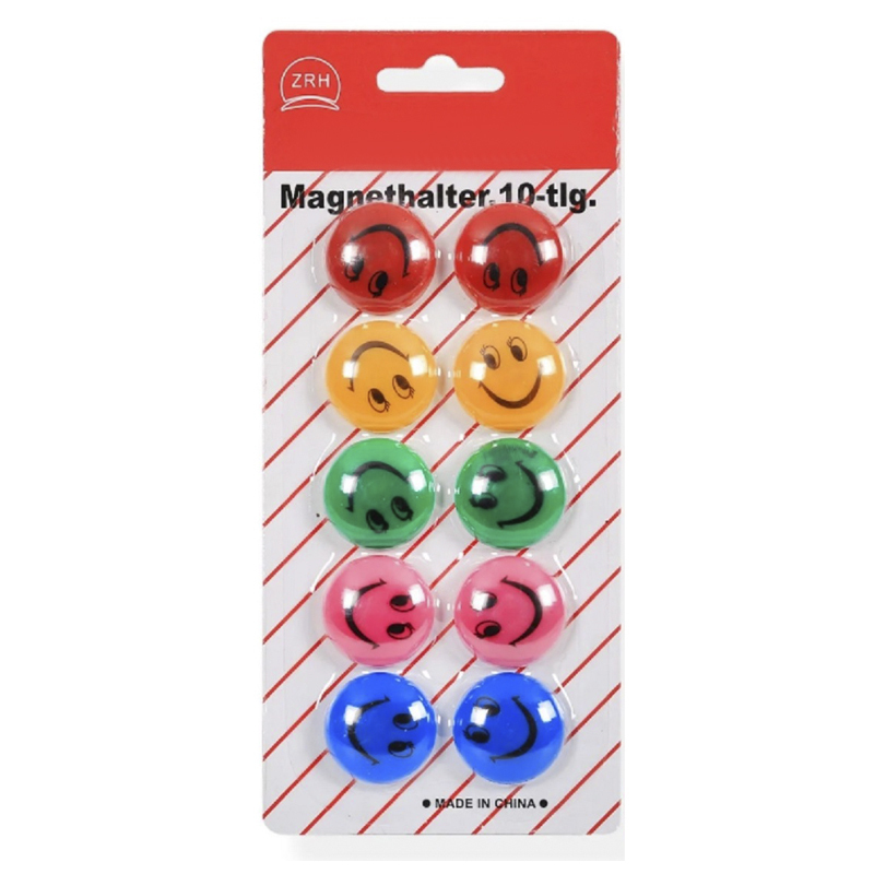 Набор магнитов: цветные, круглые, смайлики /диаметр 30 мм/, 10 штук, в блистере с европодвесом. В коробке 400 упаковок по 10 шт.