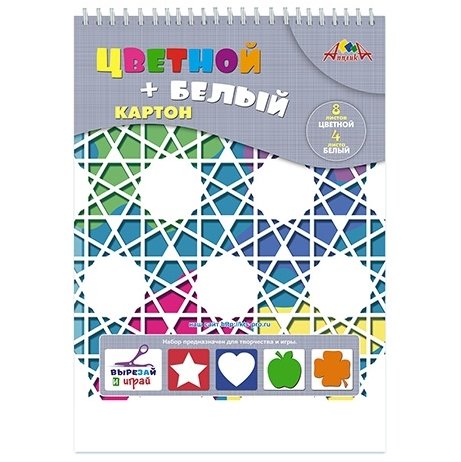 Набор цветного и белого картона Апплика, А4, 12 листов, 9 цветов, мелованный, гребень, "Белый мишка"
