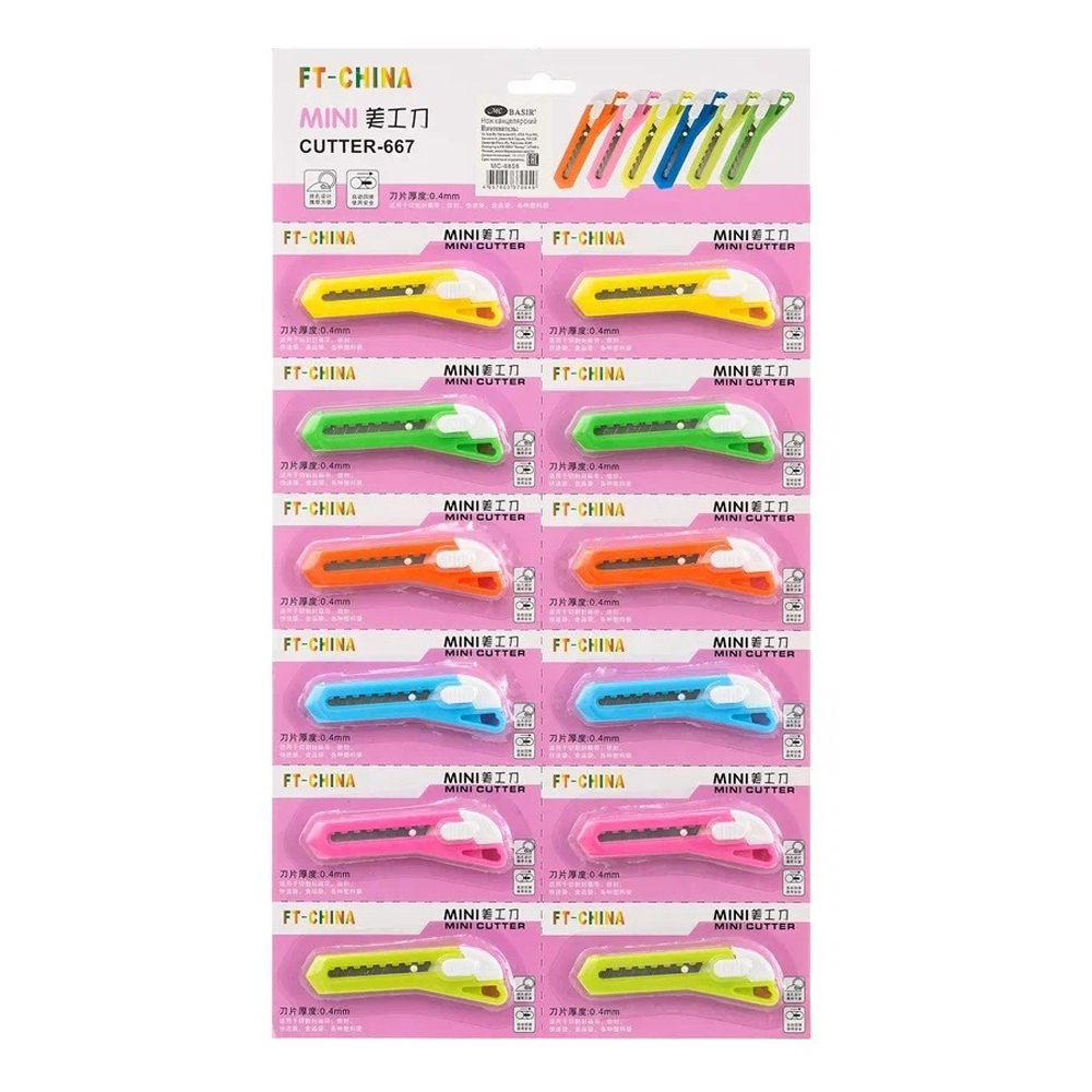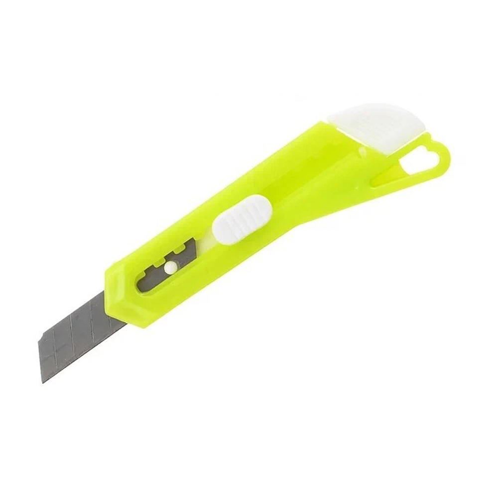 Нож канцелярский детский: фигурный цветной корпус , размер 8 см, в пластиковой упаковке на подложке.