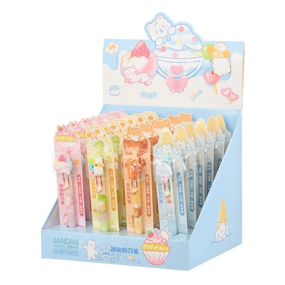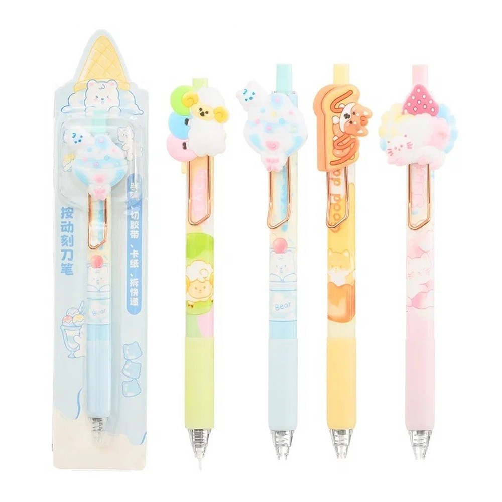 Нож канцелярский детский /авторучка/: для творчества; красивый дизайн авторучки, резиновый держатель, клип с фигурной насадкой; в пластиковой упаковке на подложке.