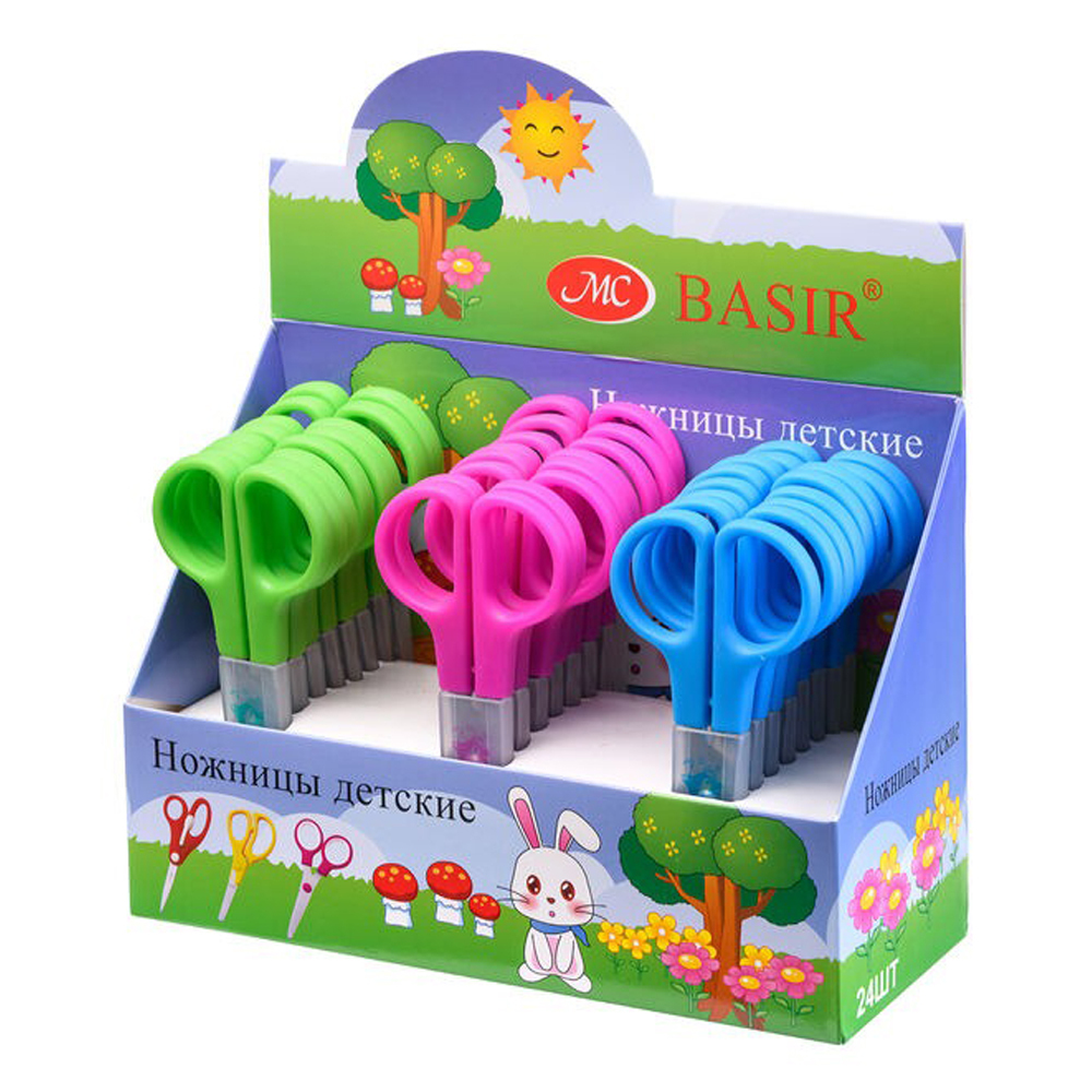 Ножницы: детские, с пластиковыми ручками, длина ножниц 12,0 см, лезвие 4,5 см, в дисплее, 3 цвета. В коробке: 480 штук
