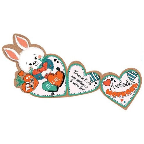 Открытка - мини двойная, с термографией, "Я+Ты=Любовь", 167х86 мм, с текстом, форма-сердце, сладости