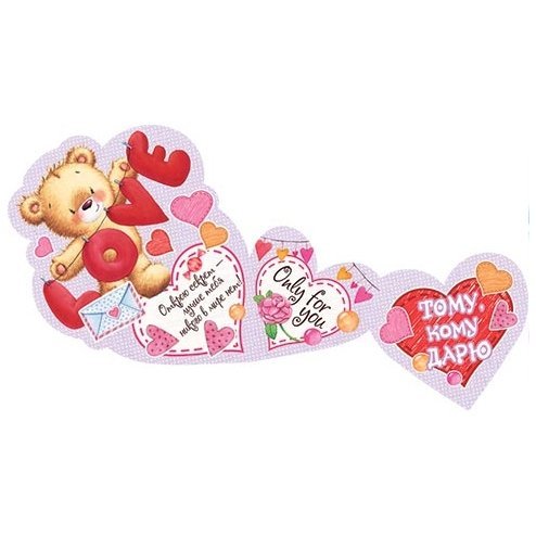 Открытка - мини двойная, с термографией, "Я+Ты=Любовь", 167х86 мм, с текстом, форма-сердце, сладости