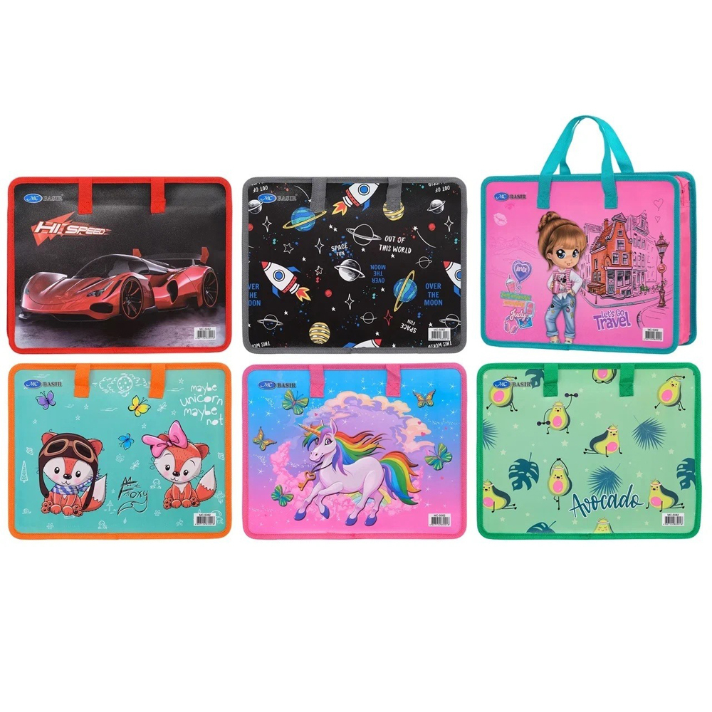 Папка пластиковая: формат А4; с тканевыми ручками и с тканевой окантовкой, рисунок-ассорти, на молнии; размер 33,5*26,5 см, ширина корешка 8 см. В коробке 12 упаковок по 12 штук.