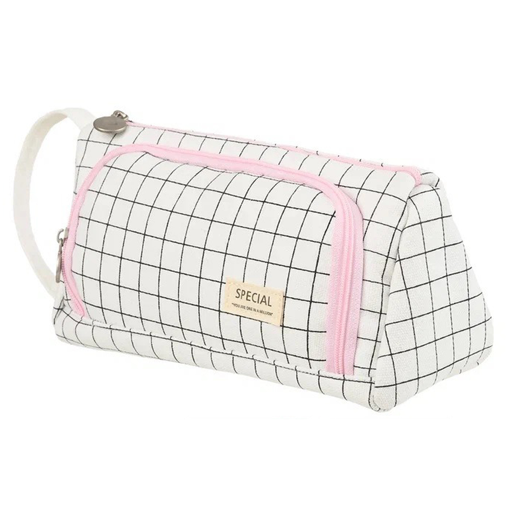 Пенал-косметичка-универсальный :материал плотная ткань /белый, клетка/, на молнии, два отделения, дополнительное отделение для канцелярских и косметических принадлежностей; размер 20*10*9 см. В коробке: 240 штук.