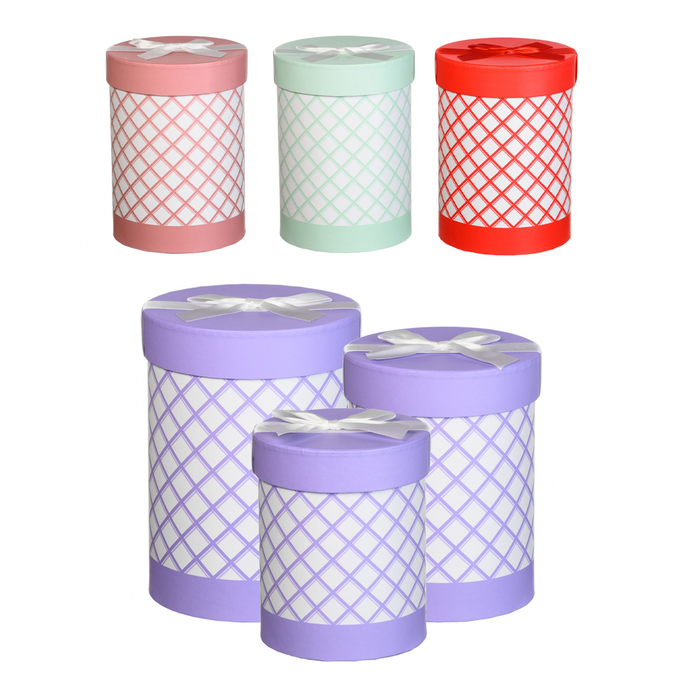 Набор подарочных коробок: 3 в 1, цилиндрической формы; цветная с рисунком-ромбики /4 цвета/, крышка с лентой, 16,5*22,5 см, 15*19,5 см, 13,5*16,5 см. В коробке 18 наборов по 3 подарочные коробки.