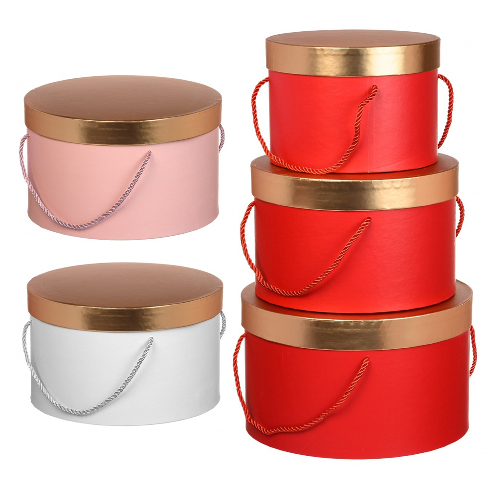 Набор подарочных коробок: 3 в 1, круглой формы; цветная коробка /3 цвета/, крышка золотого цвета, ручки-верёвки, 25/Д/*15/В/см, 22*14 см, 19*13 см. В коробке 18 наборов по 3 подарочные коробки.